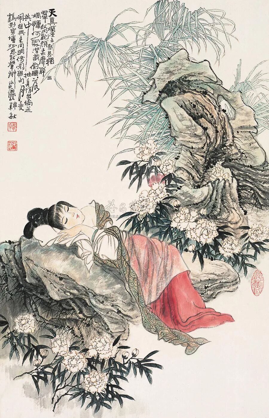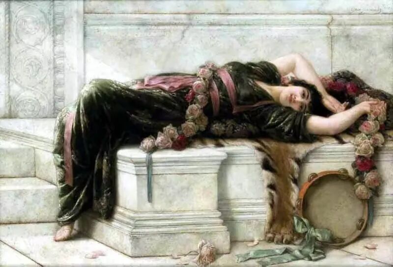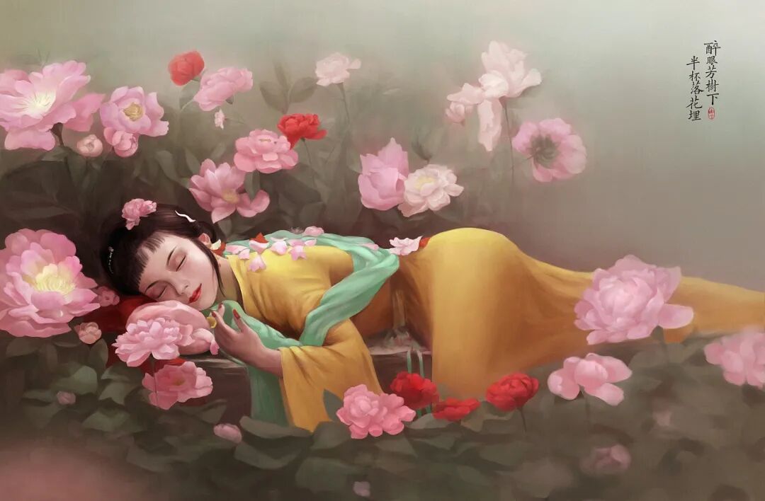 这位画家刻画的睡美人怎这么好玩呢,可爱而风情万种千娇百媚,也许是喝醉了吧,和《湘云醉卧芍药丛》这幅画还真很相似呢!只不过前者没有酣睡,还在向观者抛媚眼,而史湘云是完全醉倒在花丛中,人事不知了!