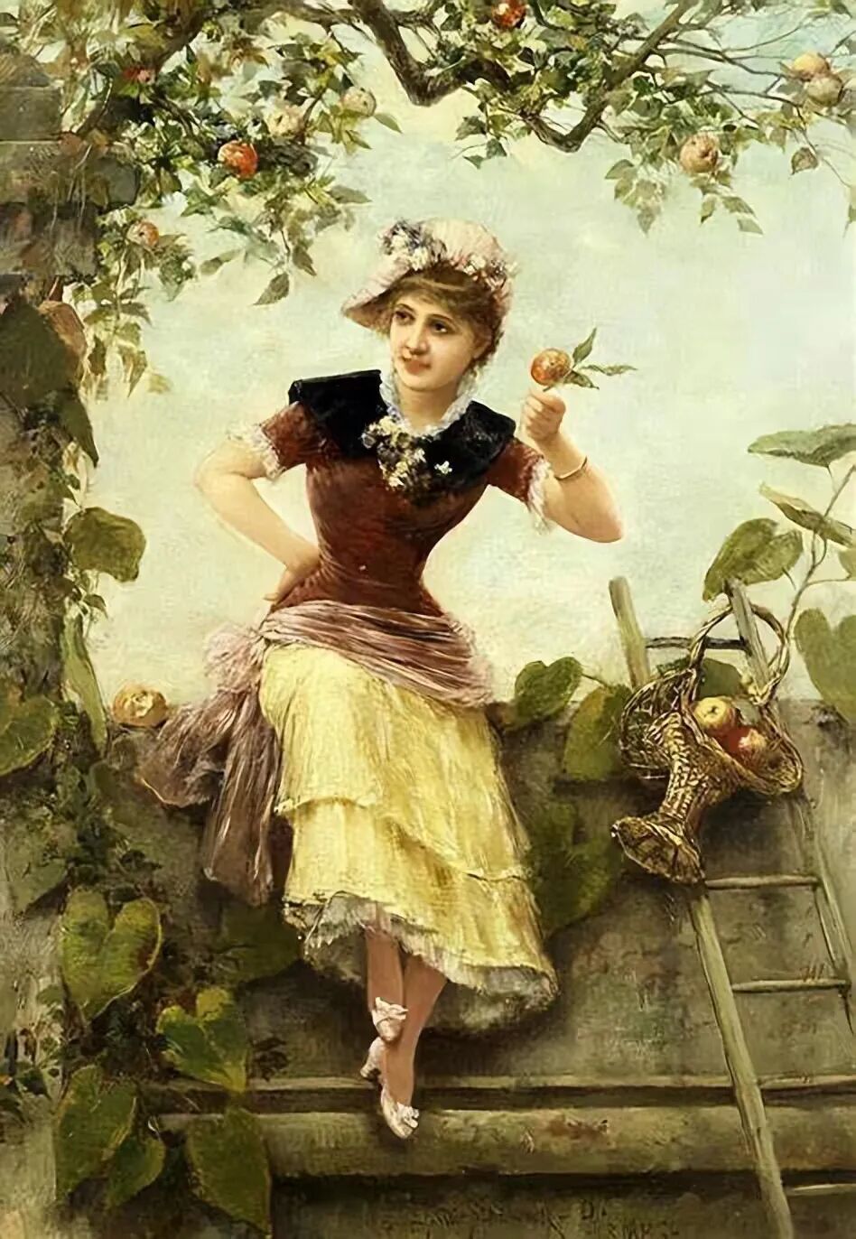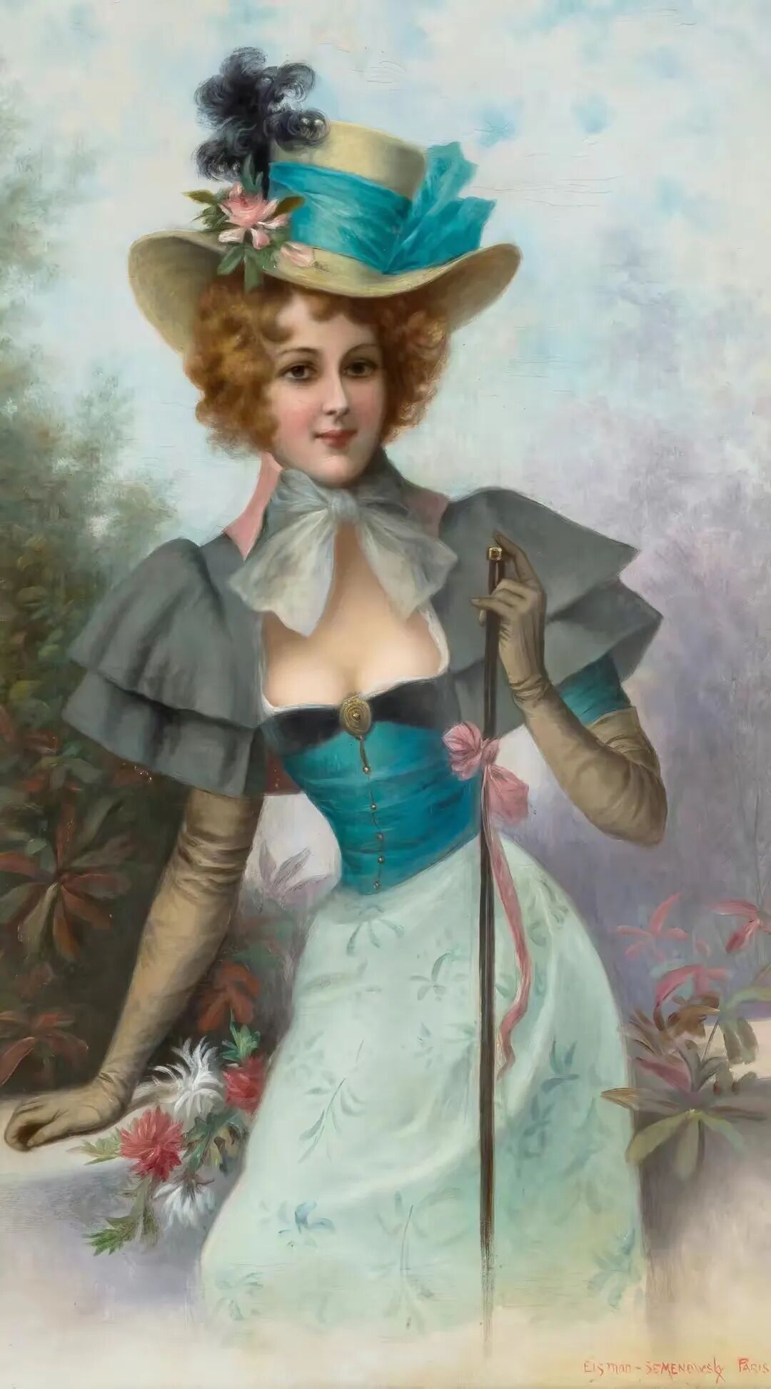这件淡绿色的抹胸上衣、灰色的泡泡袖披肩、还有那只带绿色蝴蝶结的高帽子,手里那根应该是身份的象征,整幅画看起来贵不可言!估计那时候的富家小姐出门,一定是经过精心打磨抛光的,否则她们不会这么光鲜靓丽!
