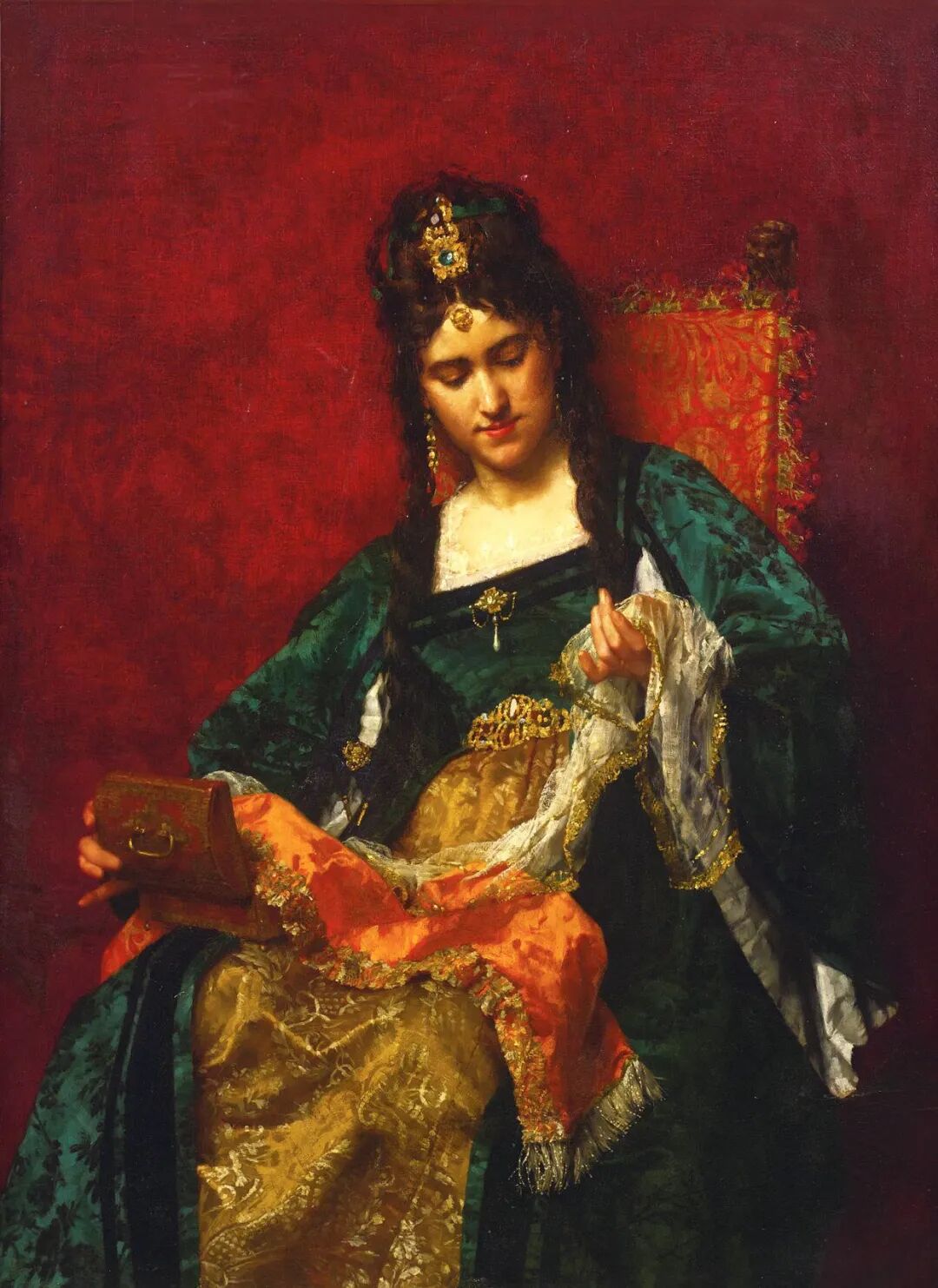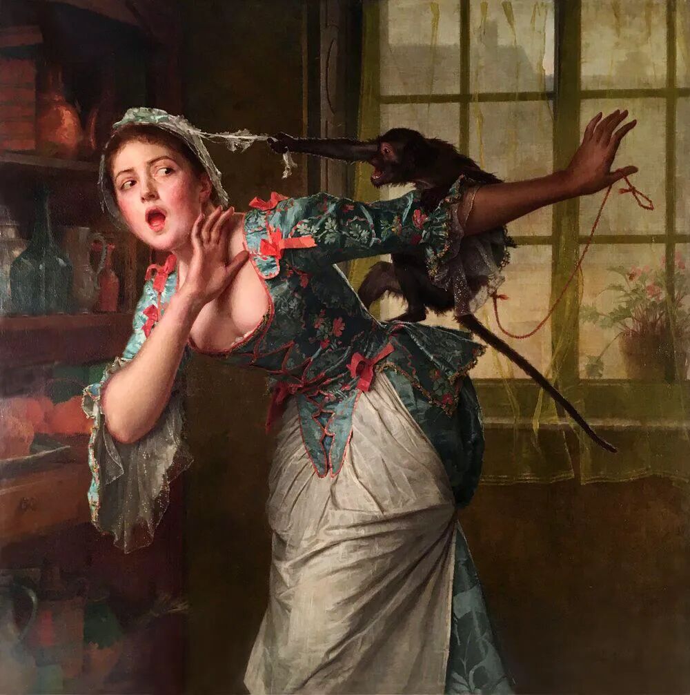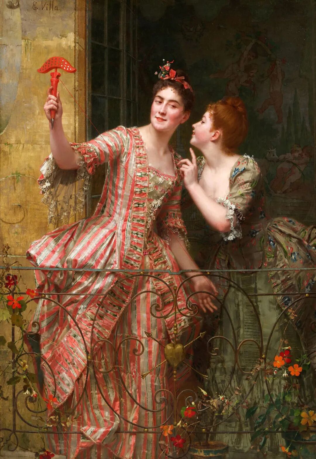 偶然发现了这幅画,难道这位富家千金手里拿的是手机自拍杆,正在阳台上做出各种姿势摆拍,可那个红色的小东西也不像啊,难道是一面漂亮的小镜子🪞!一幅很有现代切入感的场景图,欣赏起来感觉就发生在我们身边!