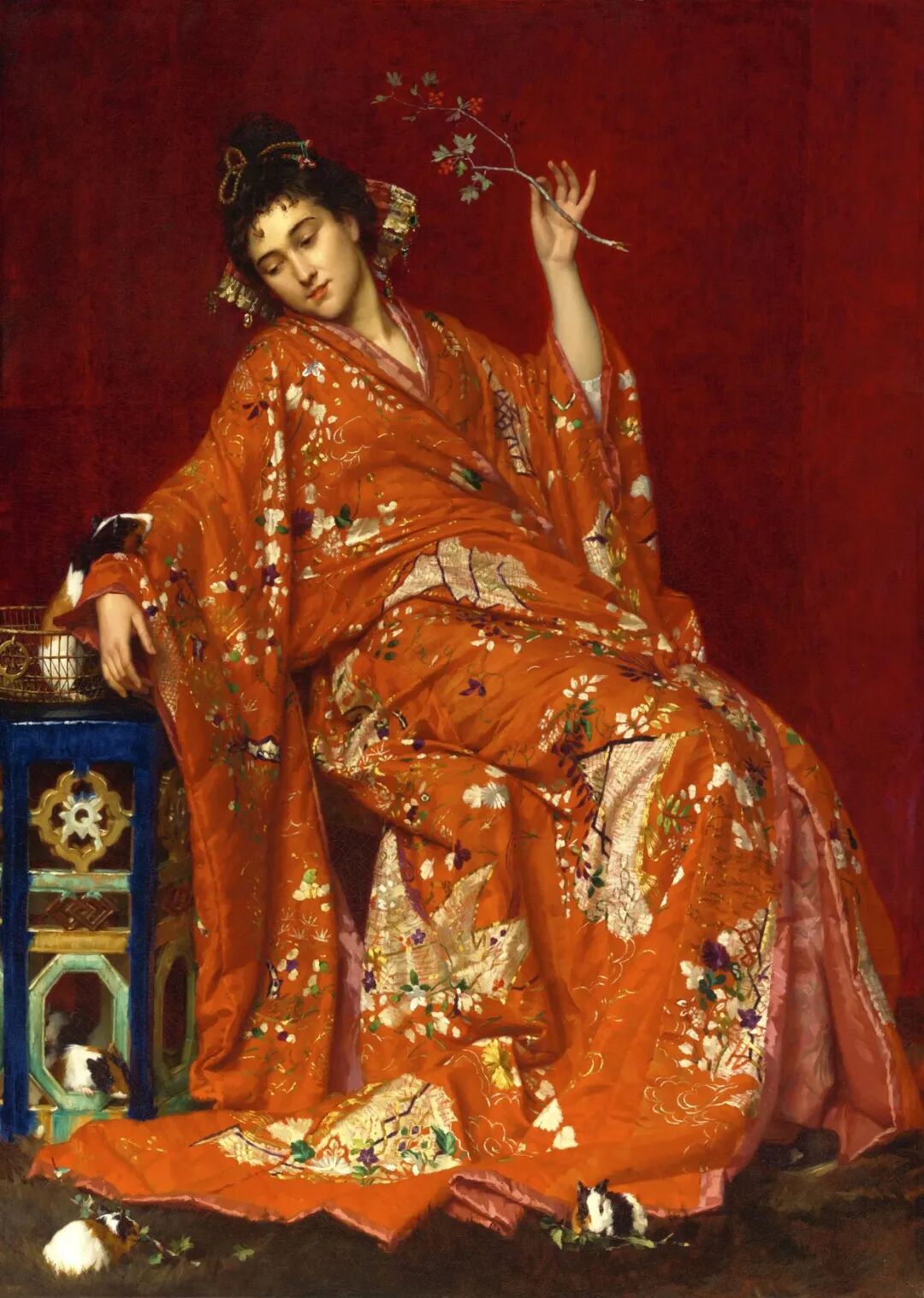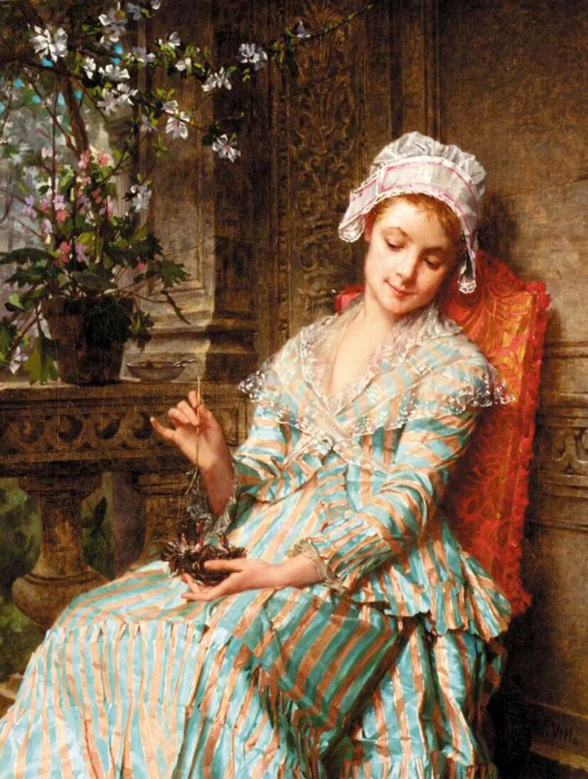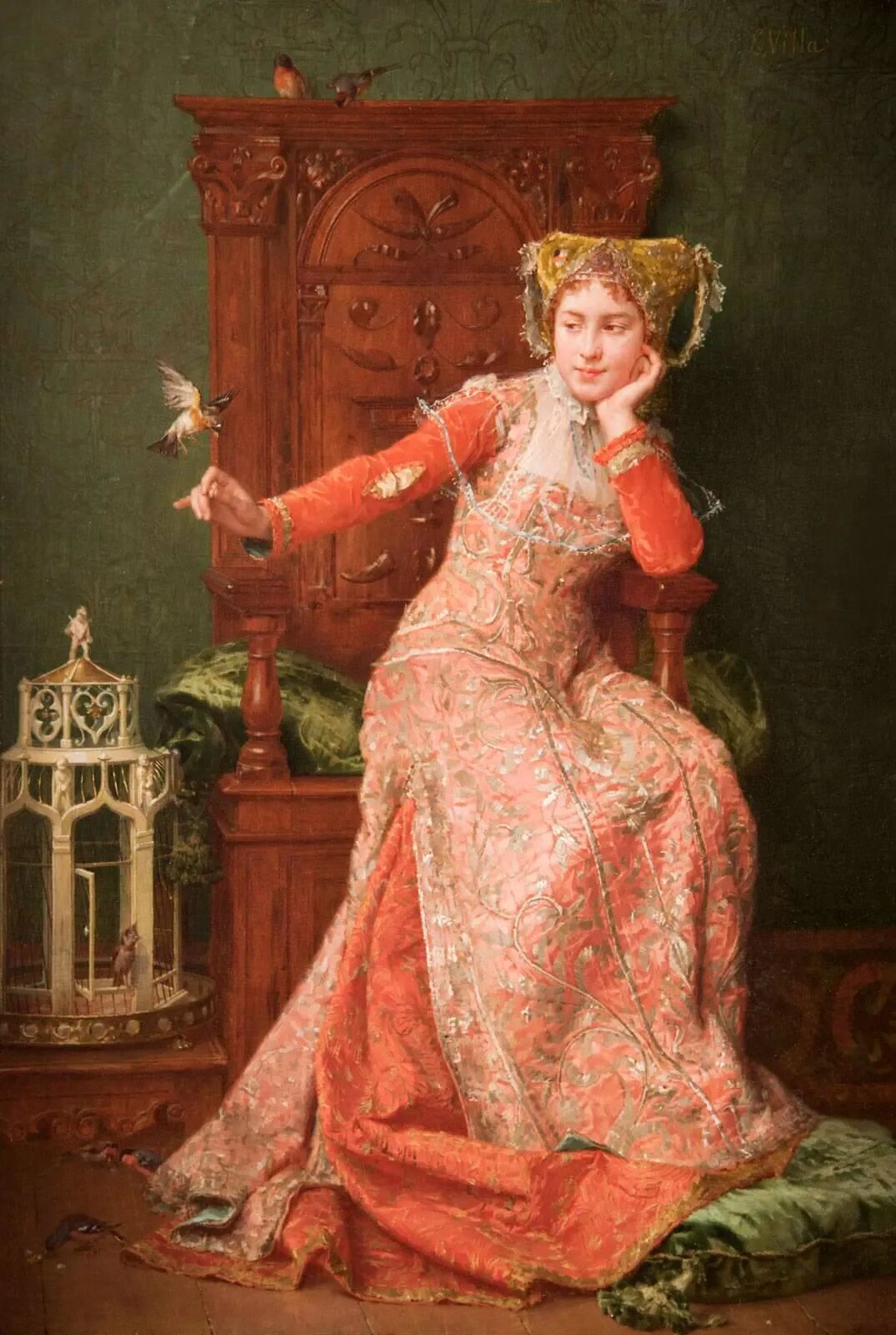 偶然发现了这幅画,难道这位富家千金手里拿的是手机自拍杆,正在阳台上做出各种姿势摆拍,可那个红色的小东西也不像啊,难道是一面漂亮的小镜子🪞!一幅很有现代切入感的场景图,欣赏起来感觉就发生在我们身边!