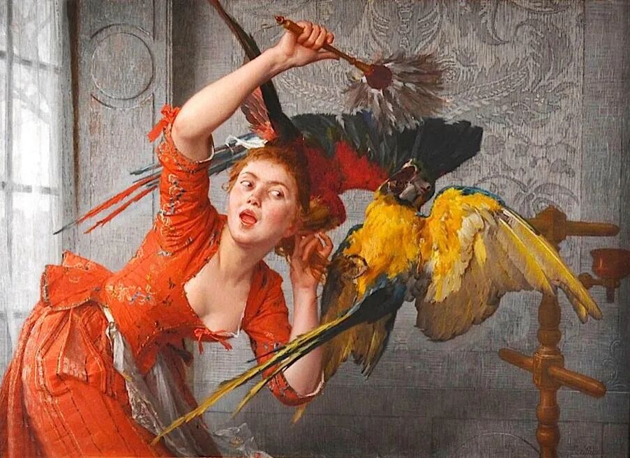女孩用鸡毛掸子跟金刚鹦鹉对打,那简直是杀鸡用木头筷子🥢,这女主人倾斜的弧度恰到好处,很好地展示了她柔软的腰肢,这表情也真太生动了!