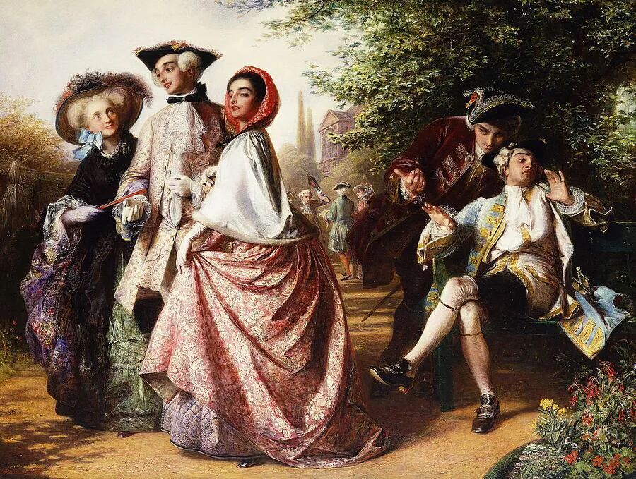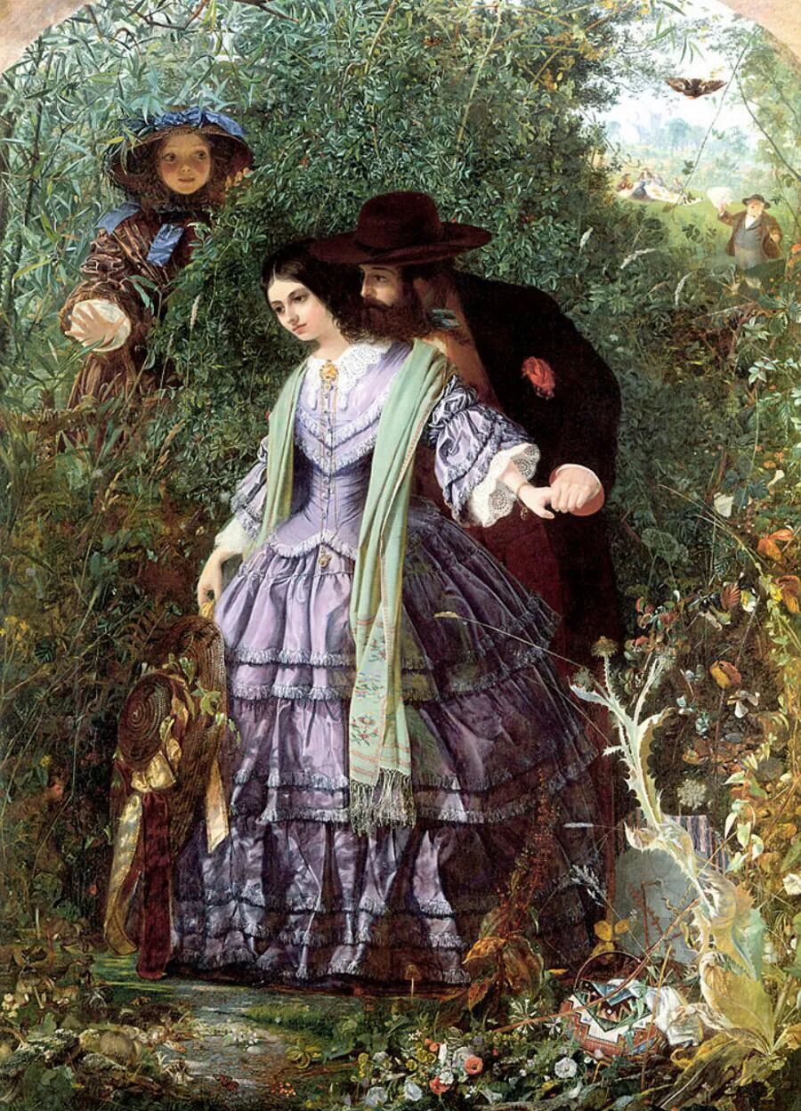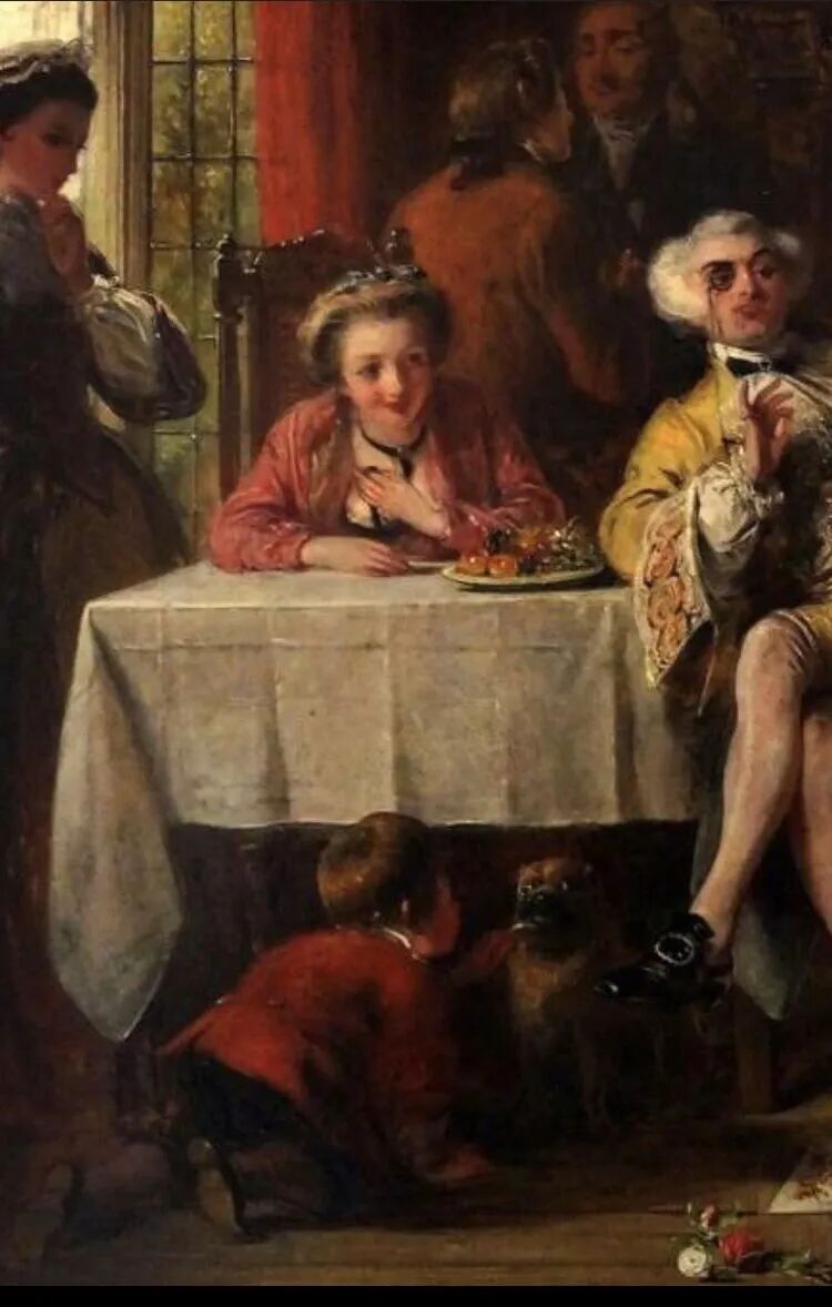 “螳螂捕蝉 黄雀在后”,这比喻夸张了一点,在这里是指男人追求女孩,背景应该是在幽深的小树林里吧!而且是悄悄地,四周没有人吧,做得这么隐秘,不过还是被一个躲在树丛中玩捉迷藏游戏的小男孩偷窥了,而且他伸出一只手👋,大概是在说:我什么也没看见,你们继续!这对热恋中的男女并没有因为他的出现,而破坏了情绪!这抓住手凑近女孩的场景非常幽默风趣诙谐,颇有喜剧味!