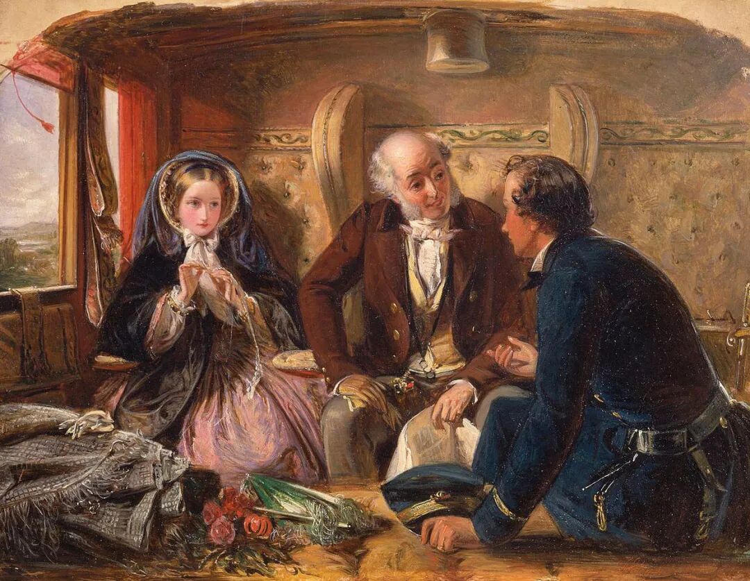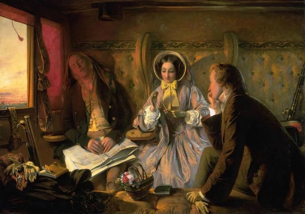《头等车厢里的一见钟情》,父亲还没打瞌睡的时候,小伙子还是挺老实的,规规矩矩地跟老人打招呼聊天,只能偷偷地看女孩几眼,看着看着就越发一见钟情了!然后老人早已看穿了她们的心事,假装靠在椅子上睡着啦,给女儿未来的女婿创造机会!“机不可失 时不再来”,好好把握,画面上显示她们坐的越来越近了……谈恋爱时,一切都是新鲜的,每天有谈不完的话题……
