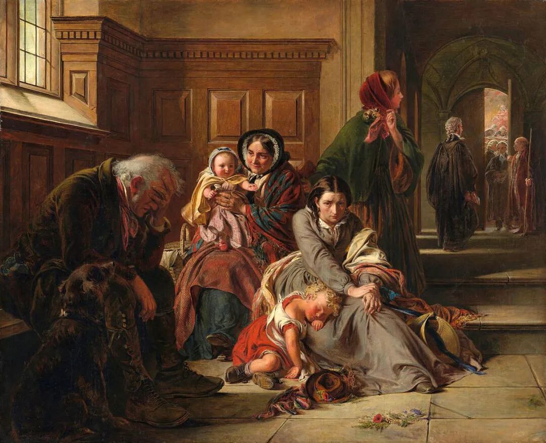 画面上披着黑衣服戴着假发套的应该是法官吧,这户人家的男人锒铛入狱被带走了!幼小的两个孩子就要失去父亲,一个孩子还在襁褓之中,妻子要失去丈夫,老人要失去儿子,于是一家人坐在门口水泥地上愁眉不展,唉声叹气,可那个坐在奶奶膝上的小孩对这一切家庭变故还浑然不知!