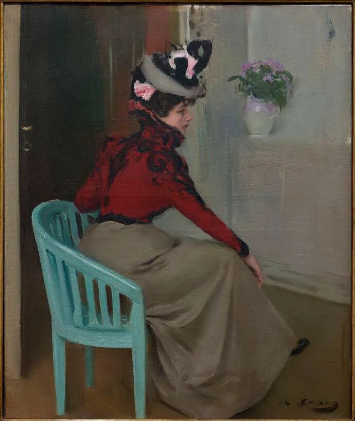 一眼能看出这是一位与众不同的女性,她一下子从那些世俗的女人中脱颖而出,难怪画家会那么喜欢她!她摆了一个非常酷的造型,神采奕奕,并且以睿智聪慧的眼神望向观者!蓝色抹胸裙,红黑相间的小马甲外套和高高盘起的头饰发髻,辉映着她白皙粉嫩的肌肤,越发显得脸蛋俊俏、妩媚动人!