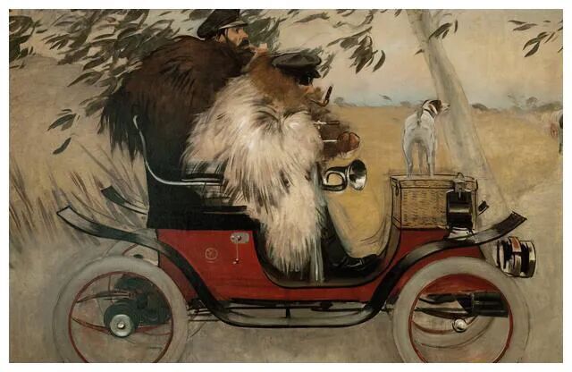 这是拉蒙·卡萨斯创作于 1901 年的一幅布面油画,现收藏于加泰罗尼亚国家艺术博物馆。画面上,画家和他朋友身穿着高档的御寒皮草,一起迎着和煦的风和灿烂的阳光,驾车奔驰在郊外的路上,车子前面还站立着一只小狗,为他们保驾护航!这应该是富家子弟兜风的敞篷车吧,看着架势威风凛凛,而又洒脱浪漫!