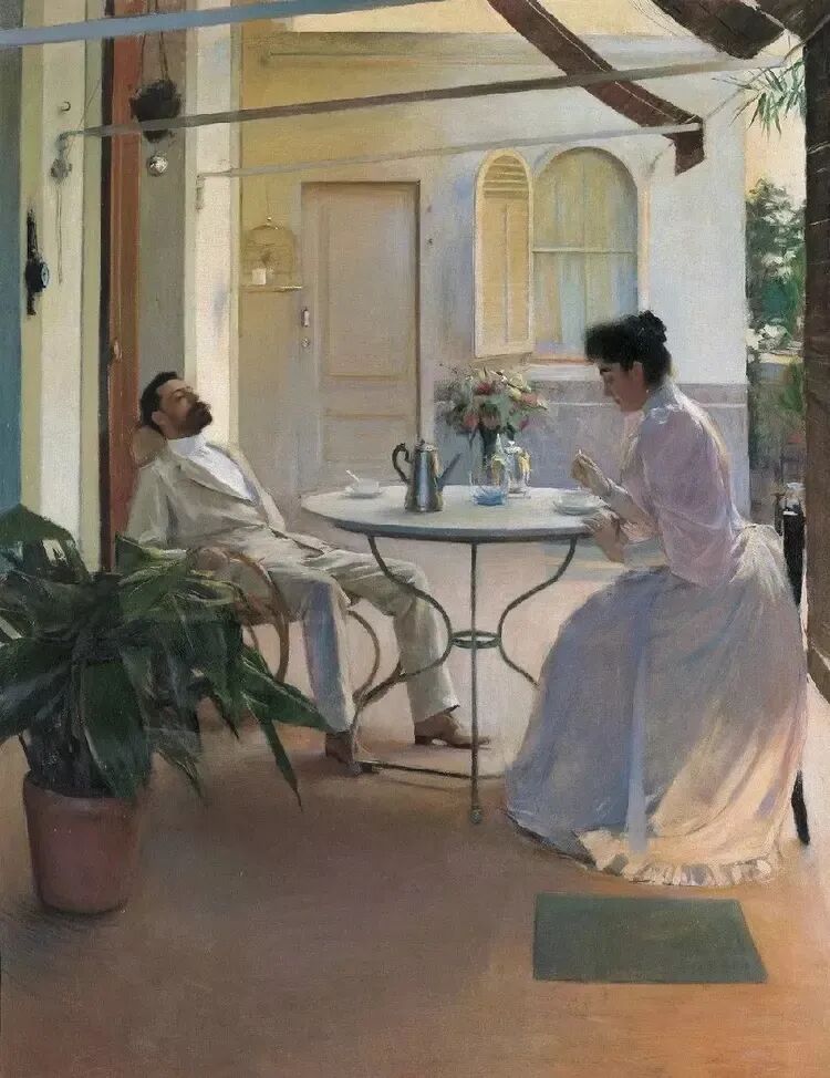 娇妻坐在餐桌前喝咖啡,画家则以无比舒服的姿势仰躺在餐椅上,看着对面年轻貌美的妻子,百看不厌,她们相差22岁!