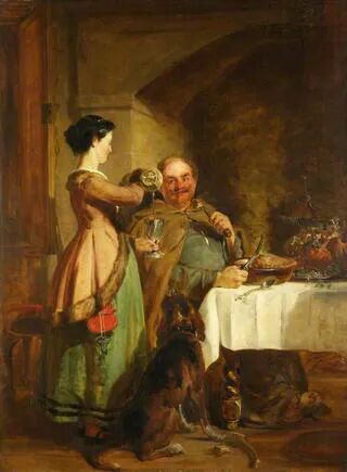 《赤脚修士》,不是说修士不近女色吗,那这幅画的酒色都占了啊,而且吃喝玩乐,有点忘乎所以了!一旁的狗狗🐶都馋死了,也不丢一块肉给它吃,这大肚修士忙着和女人调情,估计忘了……