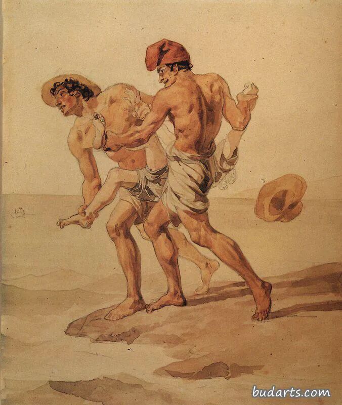 这幅画刻画的肌张力足够有力量,如脊背、双腿、双手等,远看是两个男人,其实中间还有一个小孩,估计是大人想让胆小的孩子学游泳,所以采取了极端的手段,在想方设法把他扔下水!这力度有点过猛,头上的草帽也飞走了!