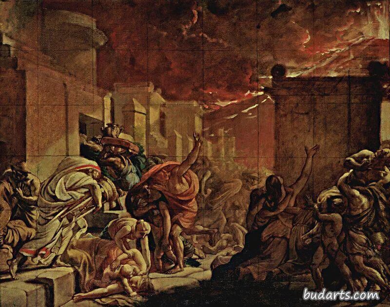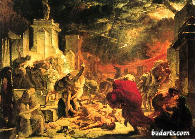 《庞贝城的最后一天》,背景是火光冲天,逃难的男女老少惊恐万状,左奔右突,却无处可逃,死亡威胁着她们……