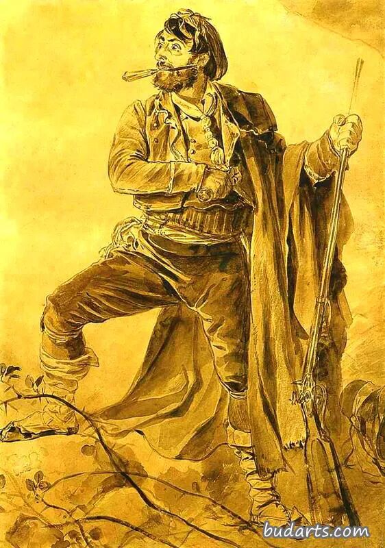 《希腊叛乱分子》,手拿长矛,腰间拔出一把刀,嘴里也有一把,一位天不怕地不怕的暴徒,要命有一条,要我放下武器,没门……拼死一搏,死而无憾!