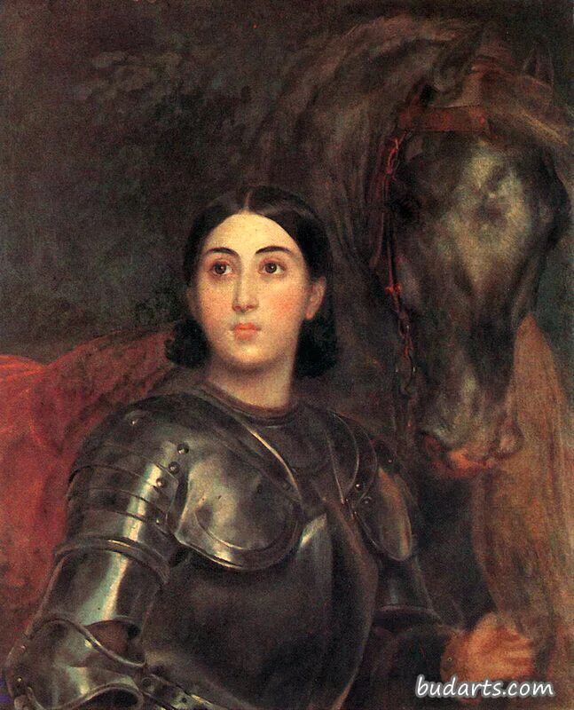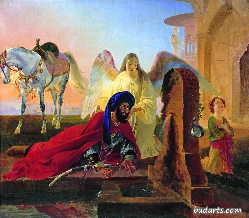 《在喷泉边》,一位奋勇杀敌的骑士受伤了,从马上摔下来,估计口渴想喝喷出来的水,却又够不着,天使及时赶到,在搀扶他……