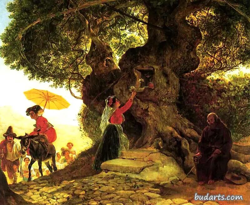 《博戈罗迪茨基橡树》,橡树虬根盘绕,枝繁叶茂,估计路过的人把它当作神树,都要上前祭奠这棵老橡树,以此保佑她们一路顺风!