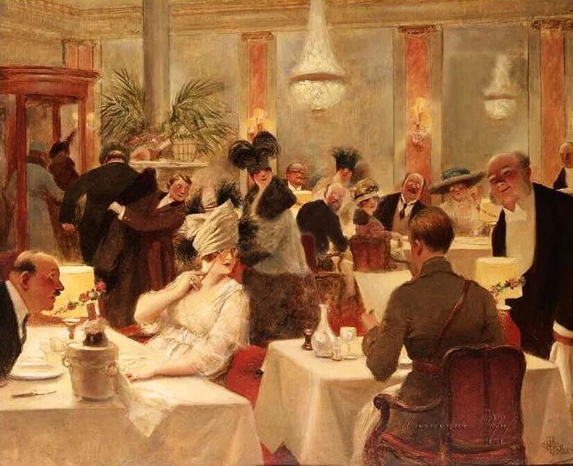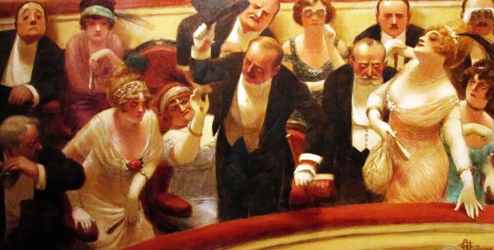 如此周围的绅士们女士们有羡慕嫉妒的,都在盯着他们两个人看!小小一幅画,人生百态图!