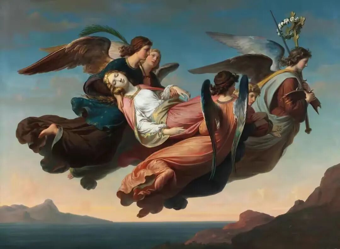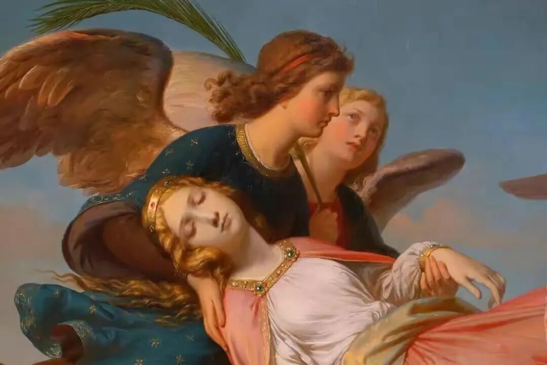 我们佛教中有一种人人向往的最高境界,那就是天堂,或者是极乐世界,或者是此岸到达彼岸,估计圣凯瑟琳是在去往极乐世界的途中!所以此时她的身躯被彩云和光线所照亮,具有了一种抚慰人们心灵的力量!这种磁场只有圣女身上才会具有,这幅画让观者感到了信仰的力量!