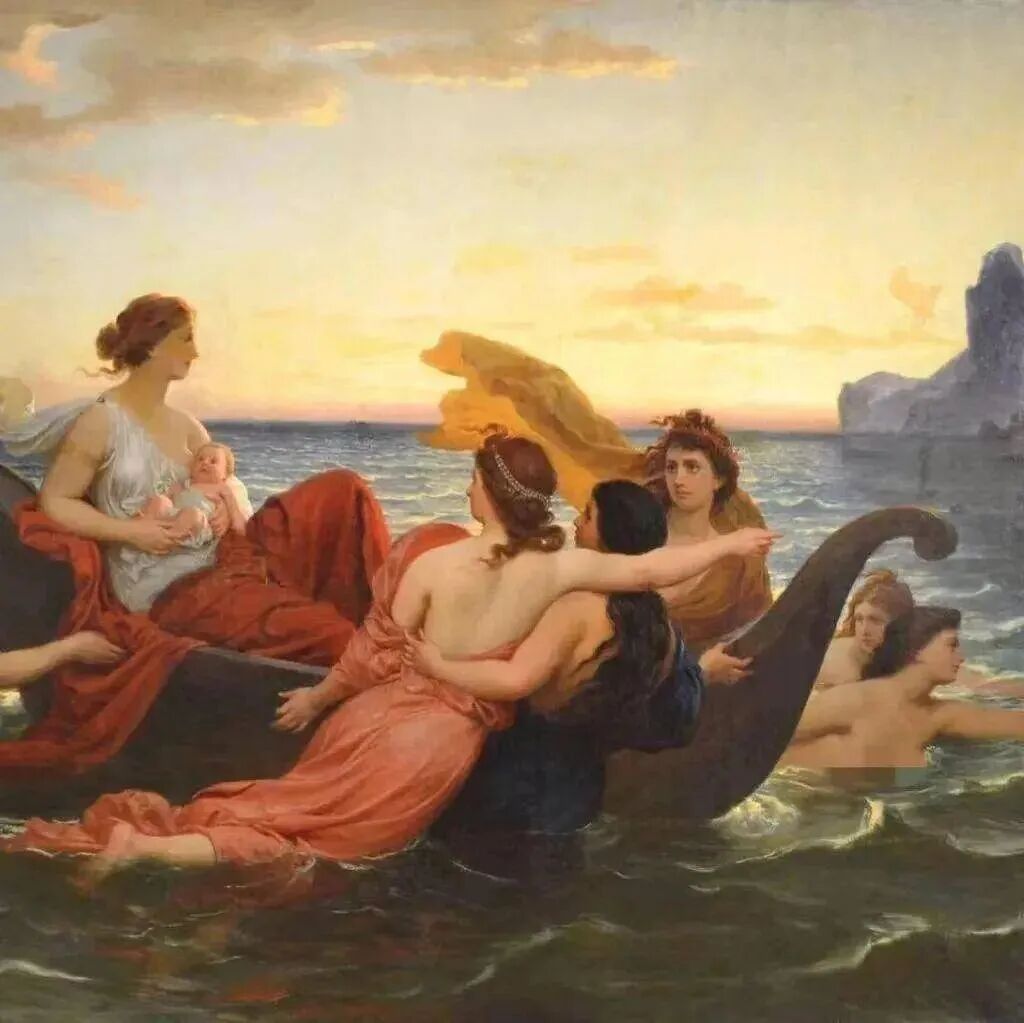 这幅画取名《圣凯瑟琳穿越西奈山》,是画家宗教题材之中最令人感动的一幅画!圣凯瑟琳是圣经中的人物,是指神圣的处女和烈士,画中的她在天使和圣徒的护送下,正在穿越浩瀚的海洋,蓝色的海面、天空的蓝天白云辉映着她曼妙的身姿,其飞翔的姿态显得神秘而诗意盎然!