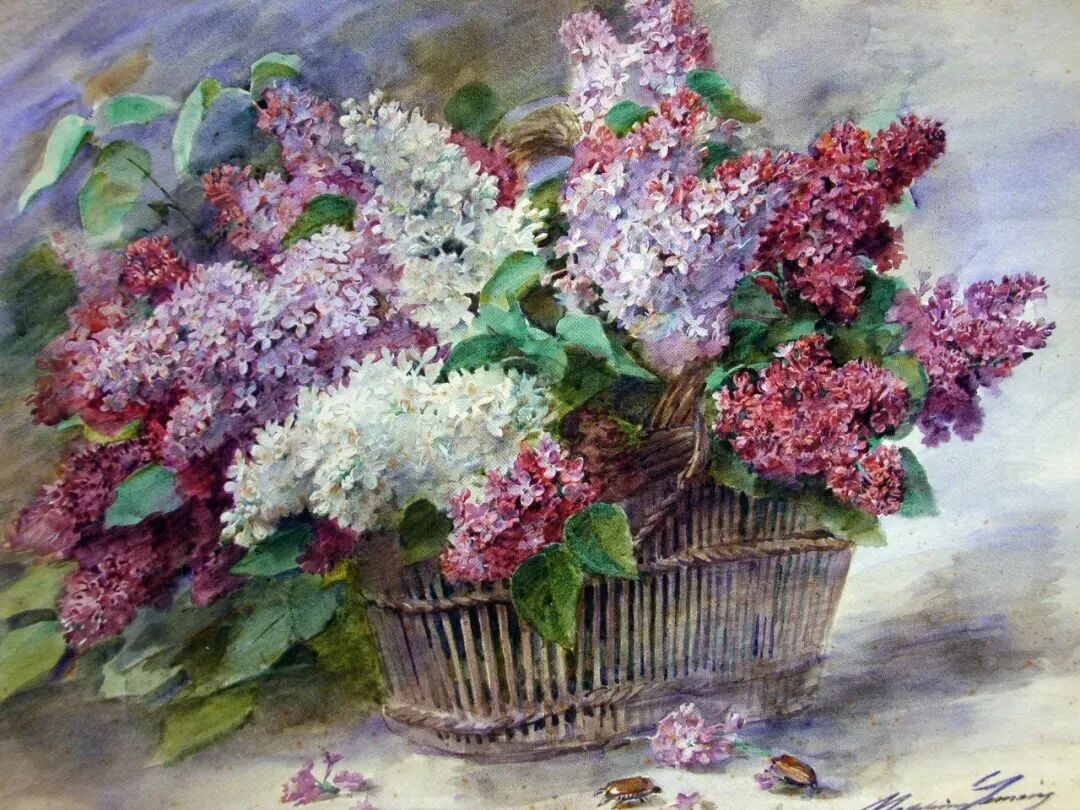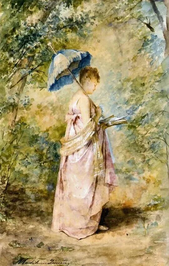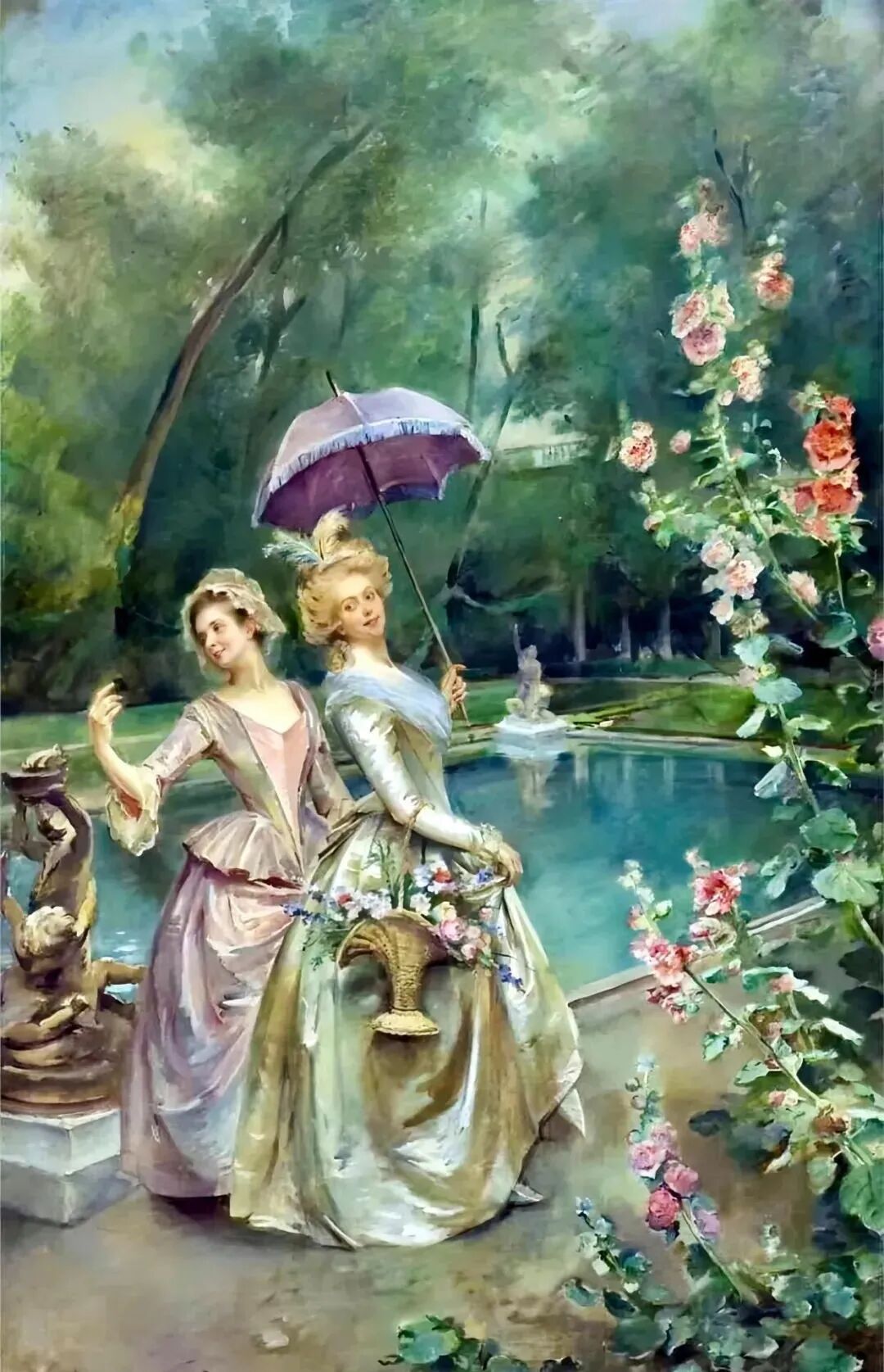 这一对姐妹花,也许是母女,穿着华丽的衣服,撑着小花伞闪亮登场了,画家以茂密葱茏的树木和清澈的湖水作为后景,前景是盛开的鲜花,她们在湖边自信洒脱地摆出了自拍的姿势!百年前应该没有手机吧,那就是女画家具有超前意识,竟然提前预约啦!
