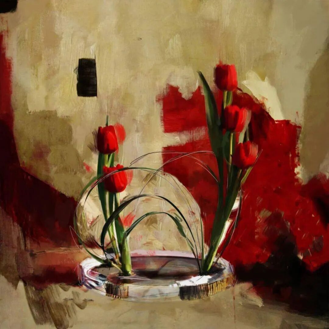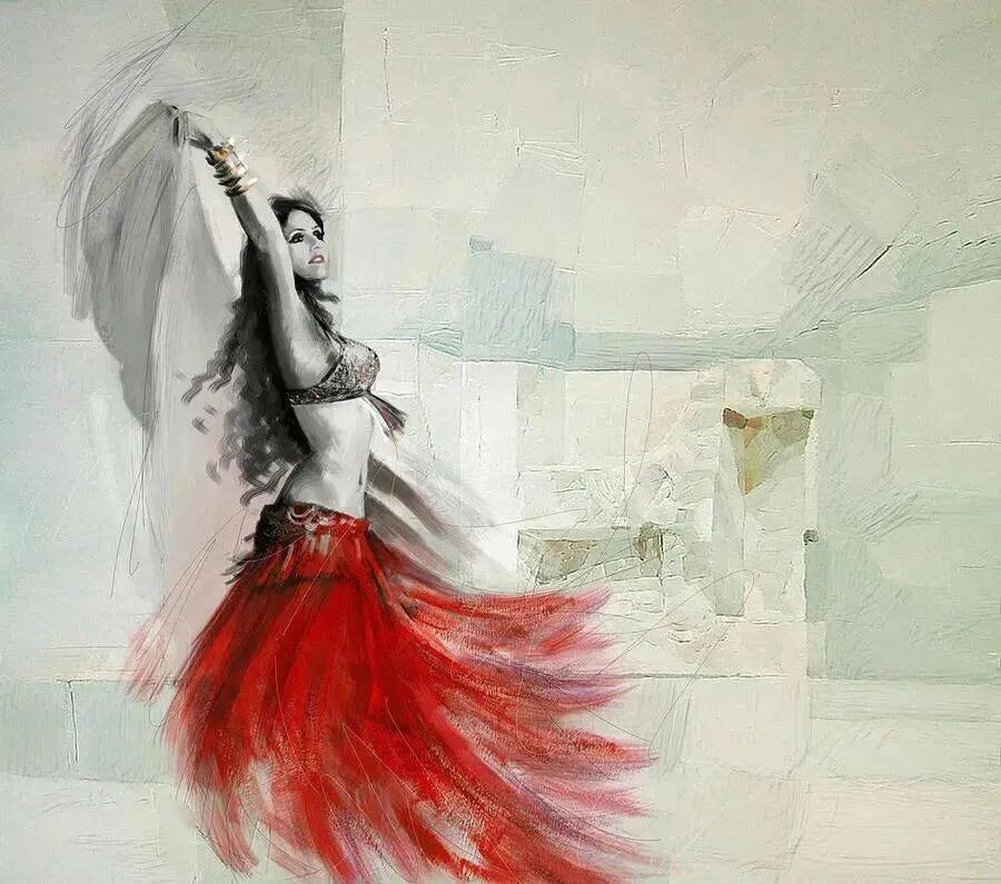 最后一幅最有创意,令小编想起了一尾在水中玩耍嬉戏的红鲤鱼,这艳舞在画家笔下真的是出神入化,讨喜又讨彩……