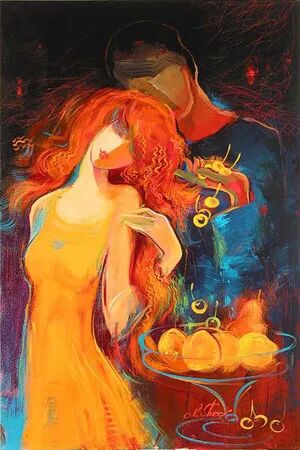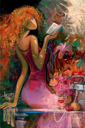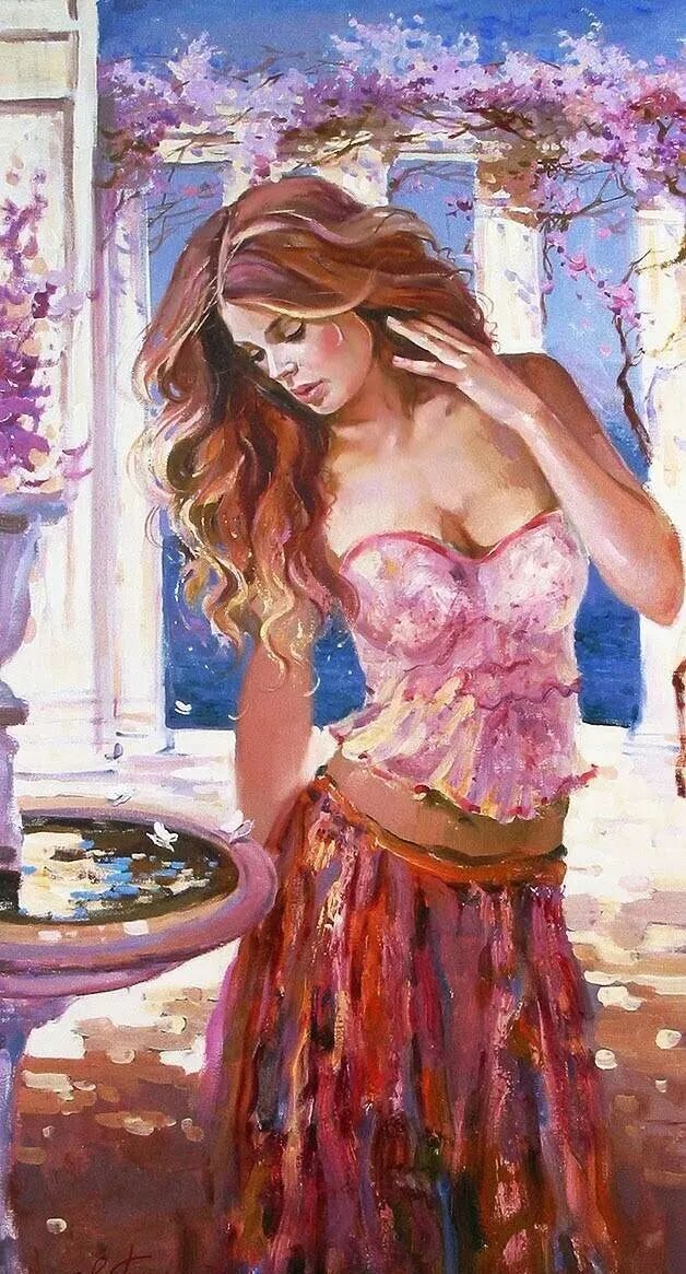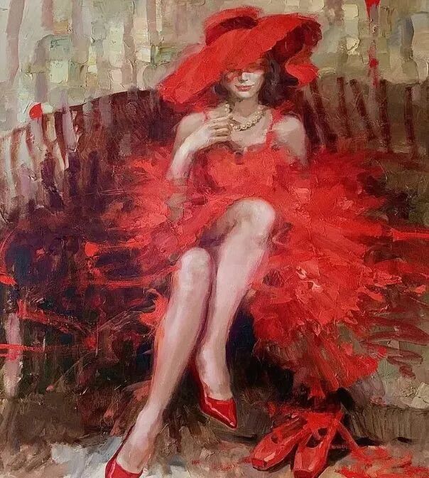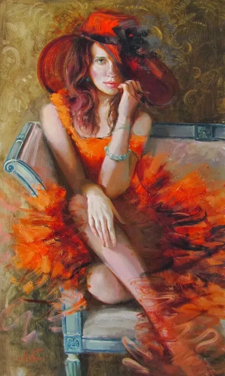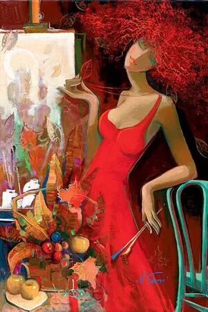 欣赏这位女画家笔下的女性角色,感觉就是活色生香的大舞台,可以开时装发布会了,给女模特们设计了那么多款式新颖华丽时尚的服饰!如果画家考虑改行时装设计师,那其前景也是十分看好的!