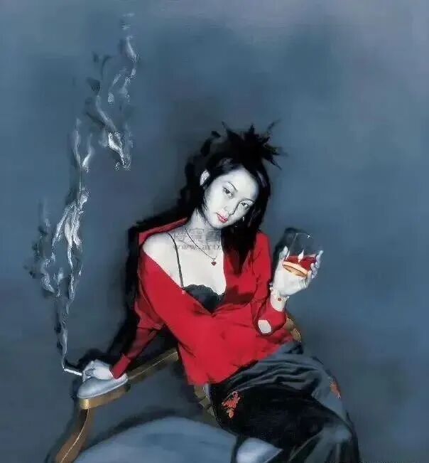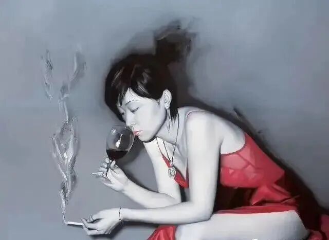 这是画家何森笔下的都市女性,喝酒、吸烟,一般都是比较前卫的女性,也有人称为不太正经的女人,她们脸部的表情凄迷、伤感、颓废,借酒消愁只能愁更愁,更加沉沦!人生走出困境,喝酒只能得到暂时的解脱,唯有依靠自己的自信和毅力,方能走出迷惘……