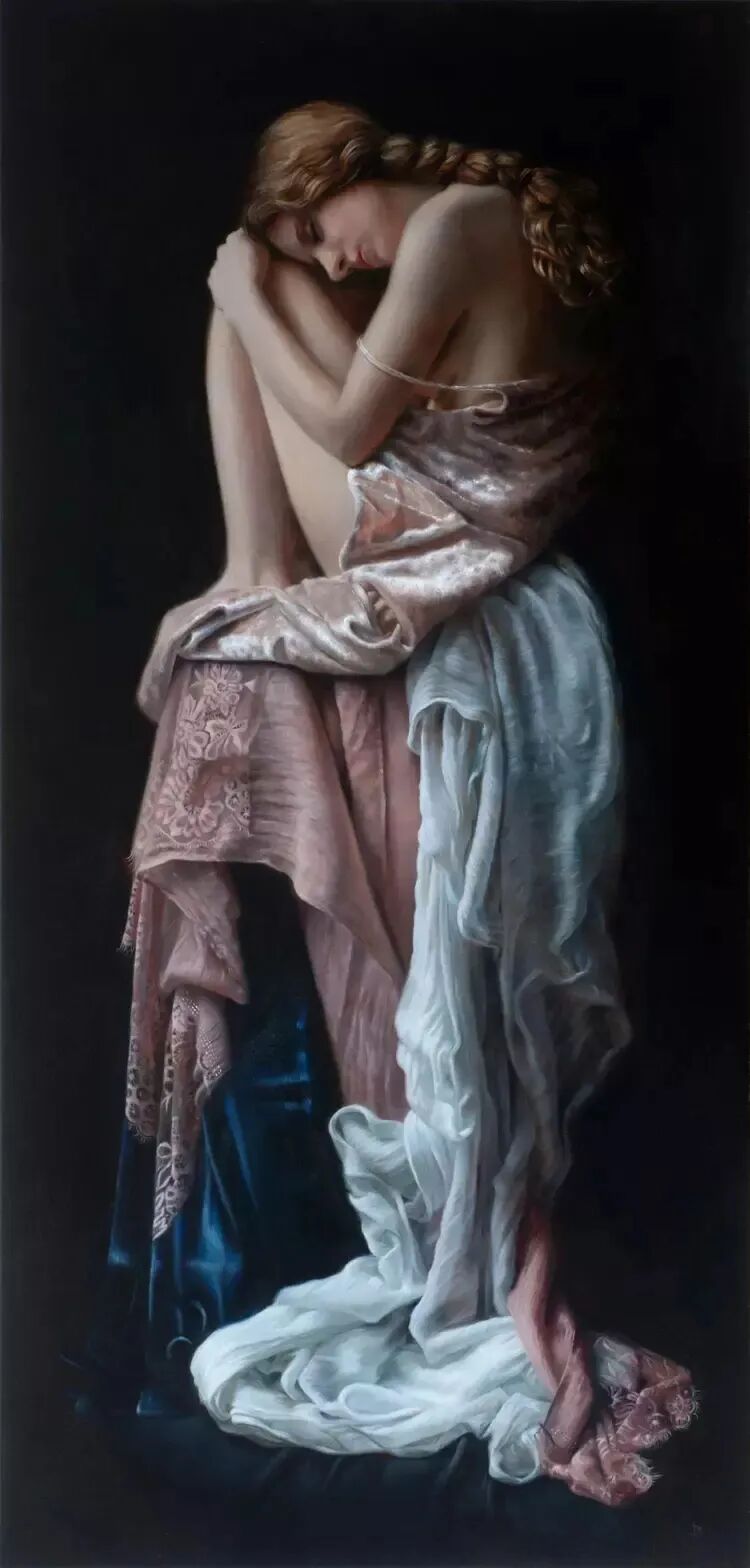另一种就是想象你在闭着眼睛盘腿打坐,你看似很安静,但思绪却是信马由缰,画家给女模特穿上了很多柔软细腻的丝质面料,暗示她此时千丝万缕的内心!