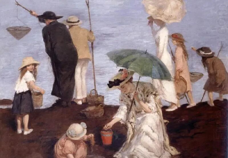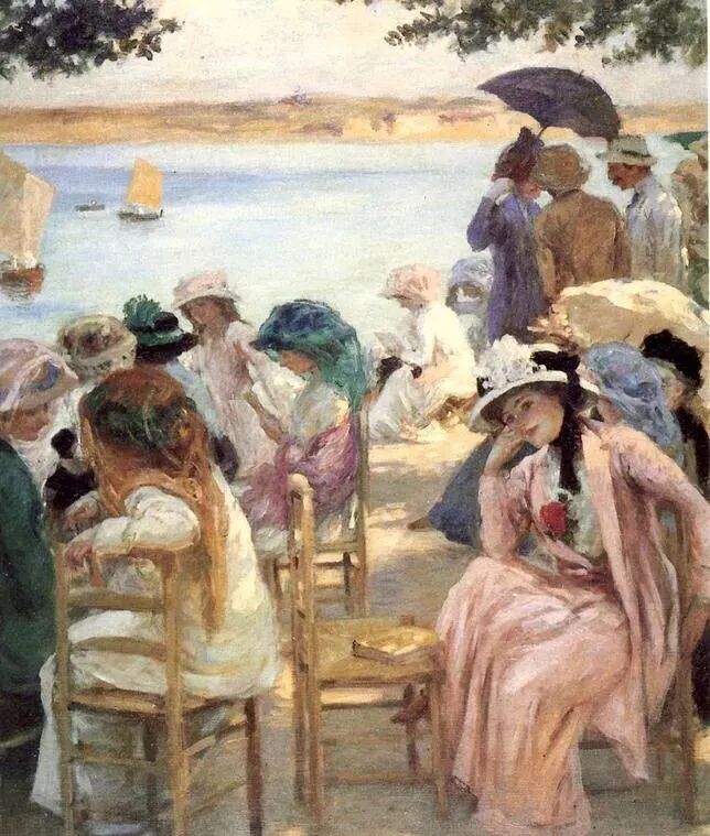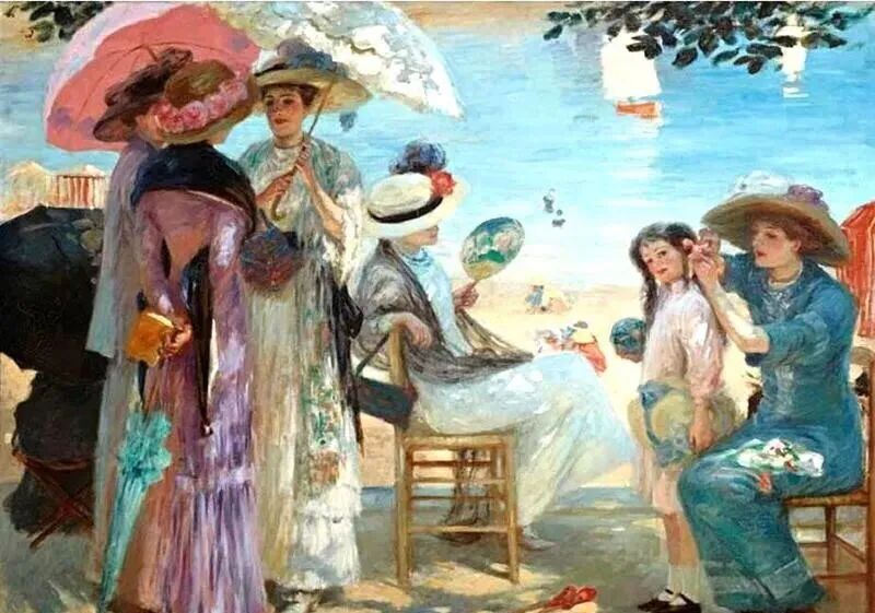 这几幅都是太太小姐们在海边游玩的场景,画家描绘了她们散漫而惬意的生活状态!