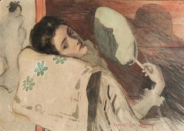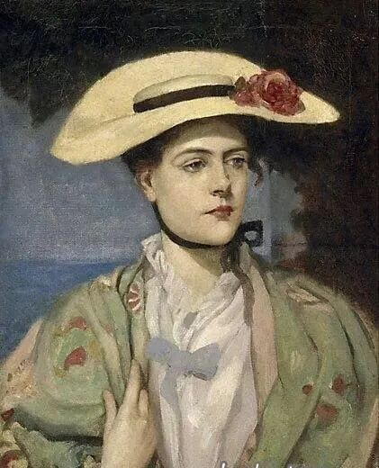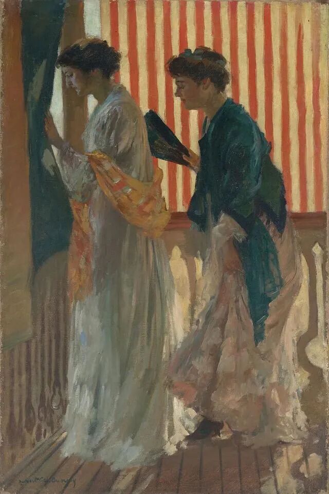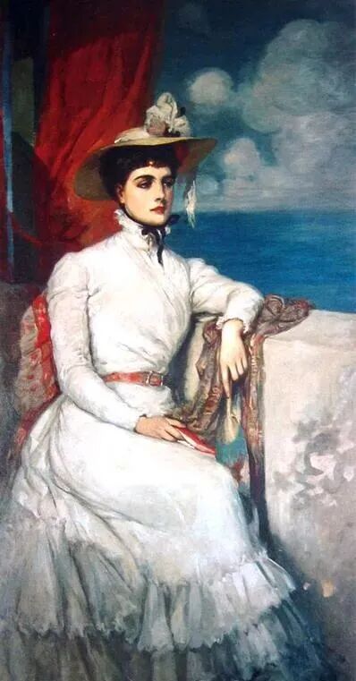 感觉和国内的仕女图有几分相似,也有人认为是形似拉菲尔前派风格!这幅《谁来了》,展示的是一位楼上的千金小姐,听见楼下有客人来访,然后拉开窗帘眺望的场景,而后面小心翼翼扶着她的是一名年长的侍女!这无疑是发生在上流社会某豪门千金的闺房之中,估计平时家教很严,难得出门,真正的大家闺秀,举手投足都是淑女的风范,平时衣来伸手 饭来张口,缺少锻炼,故显得有点弱不禁风!