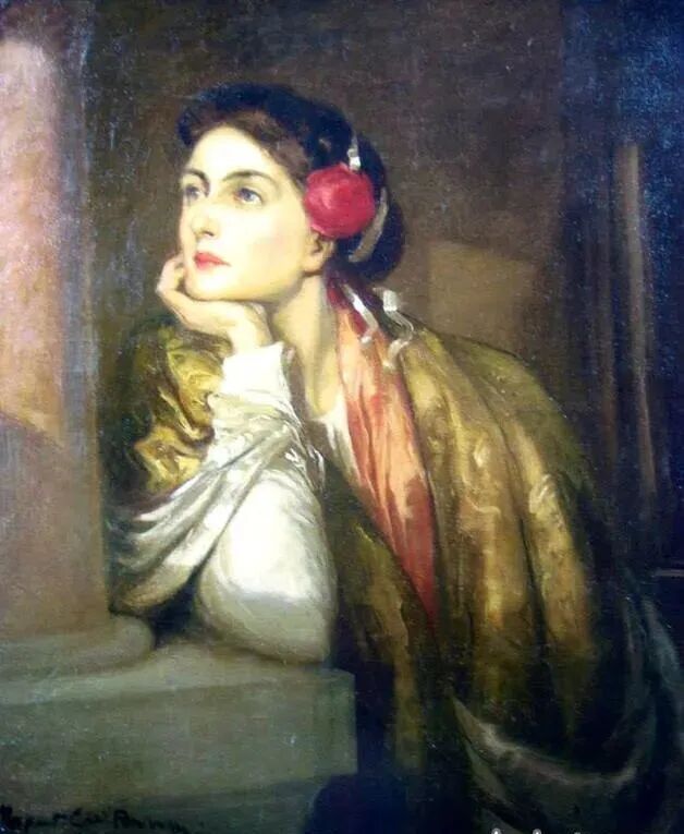 《圣塞西莉亚》,这位在阳台上托腮的美丽女子,两眼直勾勾地望着外面,不知道在思索什么!这头上戴着的红花颇有含意,也许是一名非常有名望的交际花吧,每天都在对客人迎来送往的路上,很无奈也很迷惘彷徨,不知道以后何去何从……也许可以找个好人嫁了,结束这种无着无落的生活!