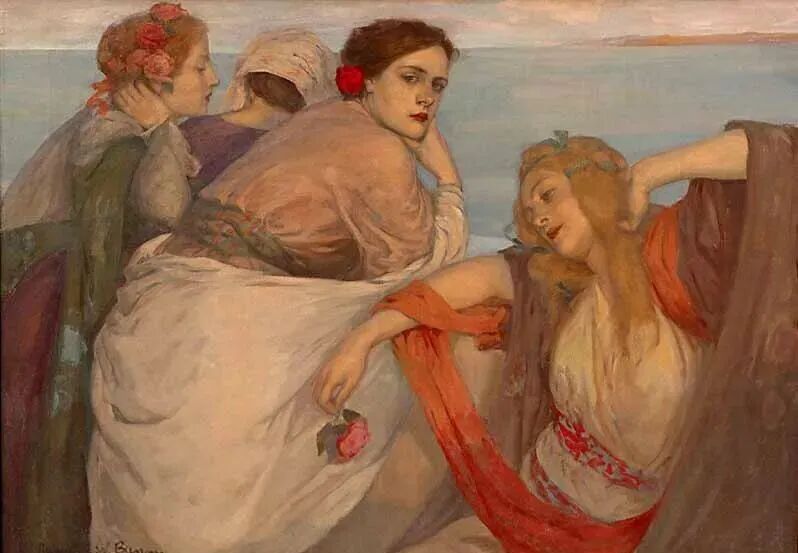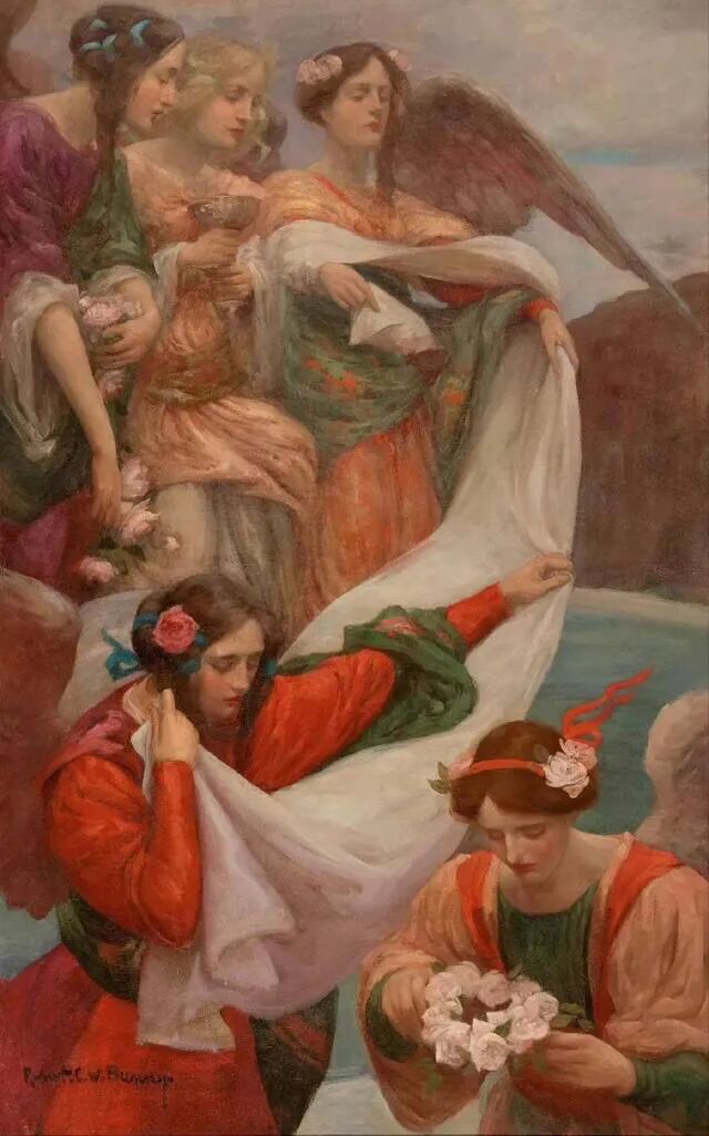 画家也喜欢刻画神话题材,例如上面这幅,前景是在海边,头上戴着白花,手上拿着白色花圈的那位女子,低头在默默哀悼亲人的逝去!而水仙女们也被感动了,一起陪在她身边!