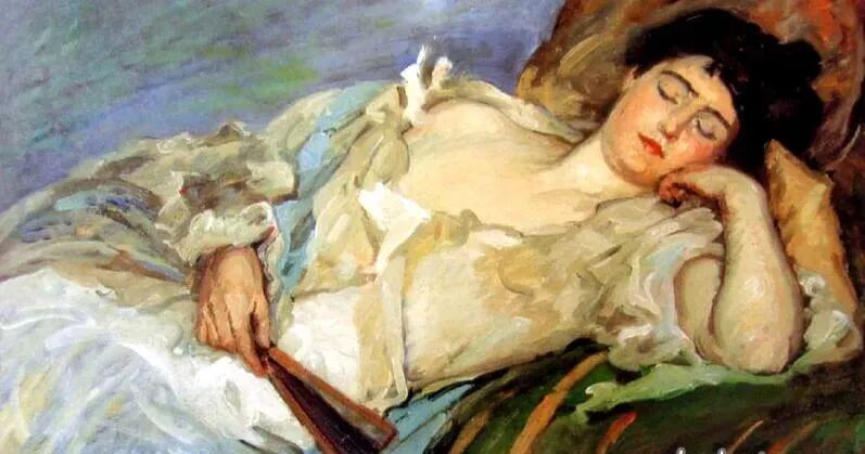 《睡着了》,非常慵懒随意的一幅画,沙发上随意一靠,一只手托着脑袋就开始午睡了,无忧无虑无烦无恼,才会睡得如此舒服安逸!一把折扇还拿在手上,脸色绯红,看情景是喜事,应该梦到令女孩心动的男朋友了吧!