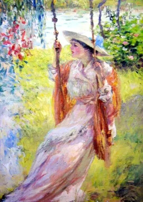 《秋千》,阳光明媚,荡个秋千轻松一下,周围生机盎然五彩缤纷的氛围也令人心花怒放,这样充满活力的青春年华,真是令人羡慕!可惜岁月如梭,晃着荡着,一转眼就容颜变老了,不知不觉皱纹已悄悄爬上额头!