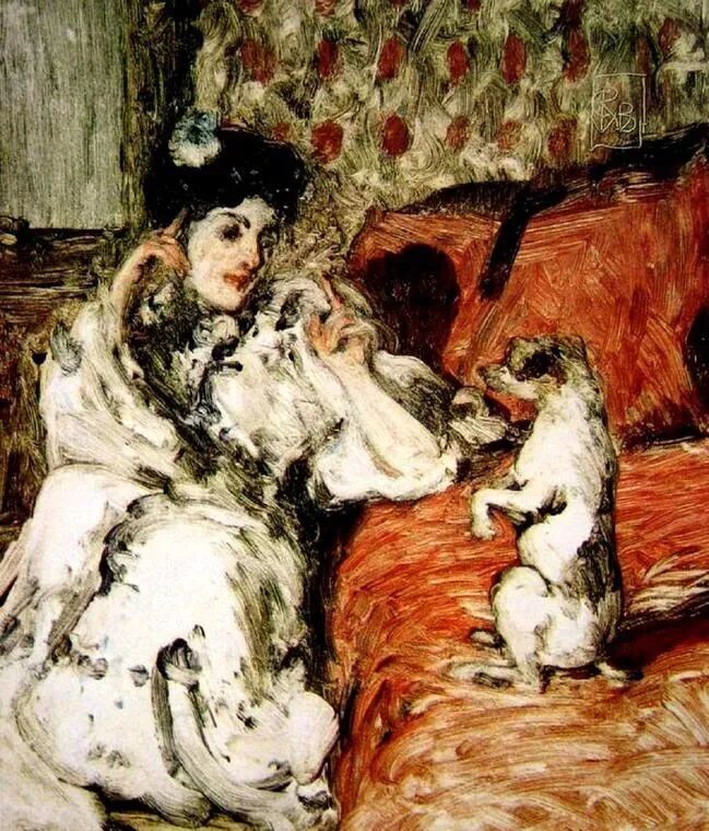 《珍妮和她的小狗》,珍妮小姐似乎很忧伤,也许是失去了爱情,或者是亲情友情、所以感觉无依无靠,只能与一条小狗相依为命!这幅画跟邦尼太太那幅完全是两种心态!现代人养狗的不要太多,每天早上去公园散步,都会看到遛狗的人,有年轻人也有老人,而且一不小心还会踩到一堆狗粑粑!