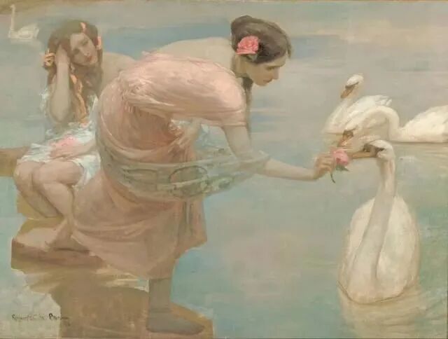 悠闲地在湖边睡着啦,只有几只大白鹅还漂浮在水面上,给画面增添了几分活力!这种淡雅的色彩和氛围,正是上流社会优雅慵懒生活的真实写照!