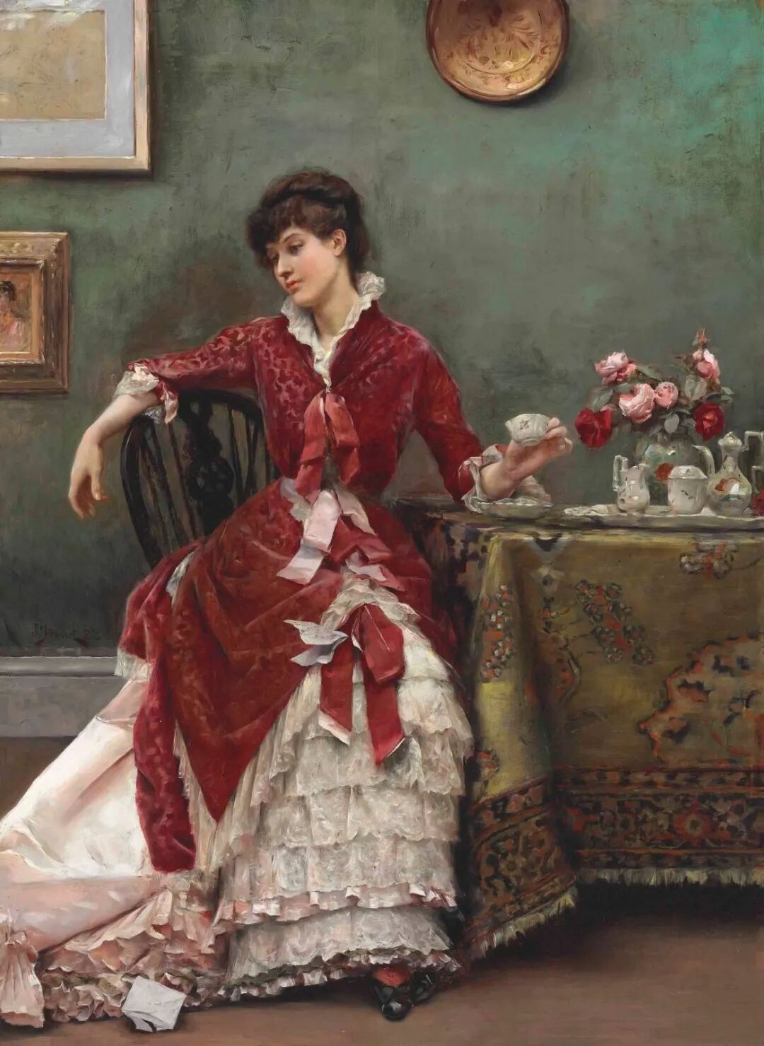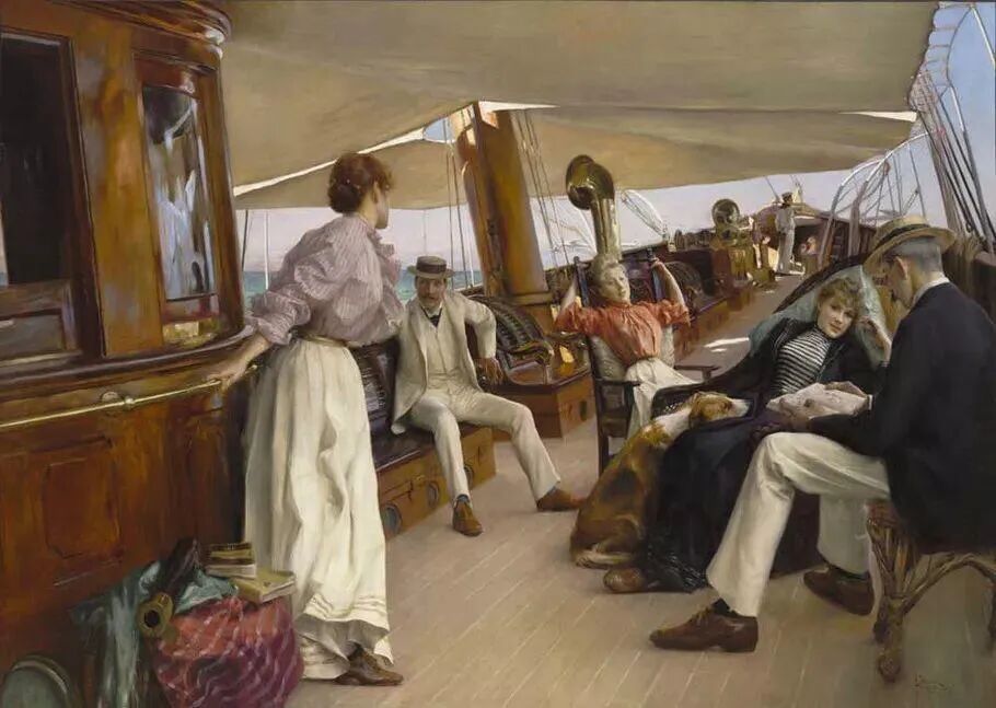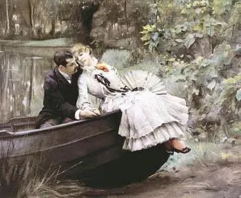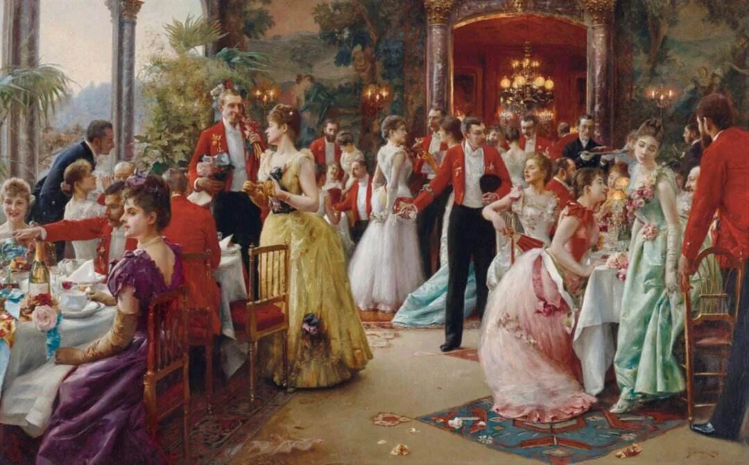 这位画家的大多数作品都来自于上流社会的沙龙聚会、舞会、一起游玩等!看看有钱人多浪漫多有情调多有诗意,贫民百姓是玩不起的,忙着为一日三餐、一家人的生计东奔西跑,哪有闲钱去玩感情游戏!