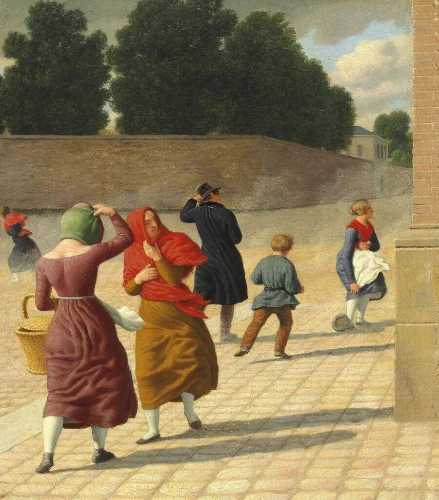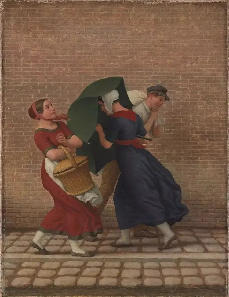 风雨雷电交加,不管发布黄色还是红色预警,该出门的还得出门!换作我们身边的人,上班族不能迟到,否则会被老板扣钱,送外卖的当然不能缺席,越是风雨,生意越好!画家把人们匆匆忙忙赶路的场景,浓缩在这幅画中,一幅非常具有现实主义的画面!