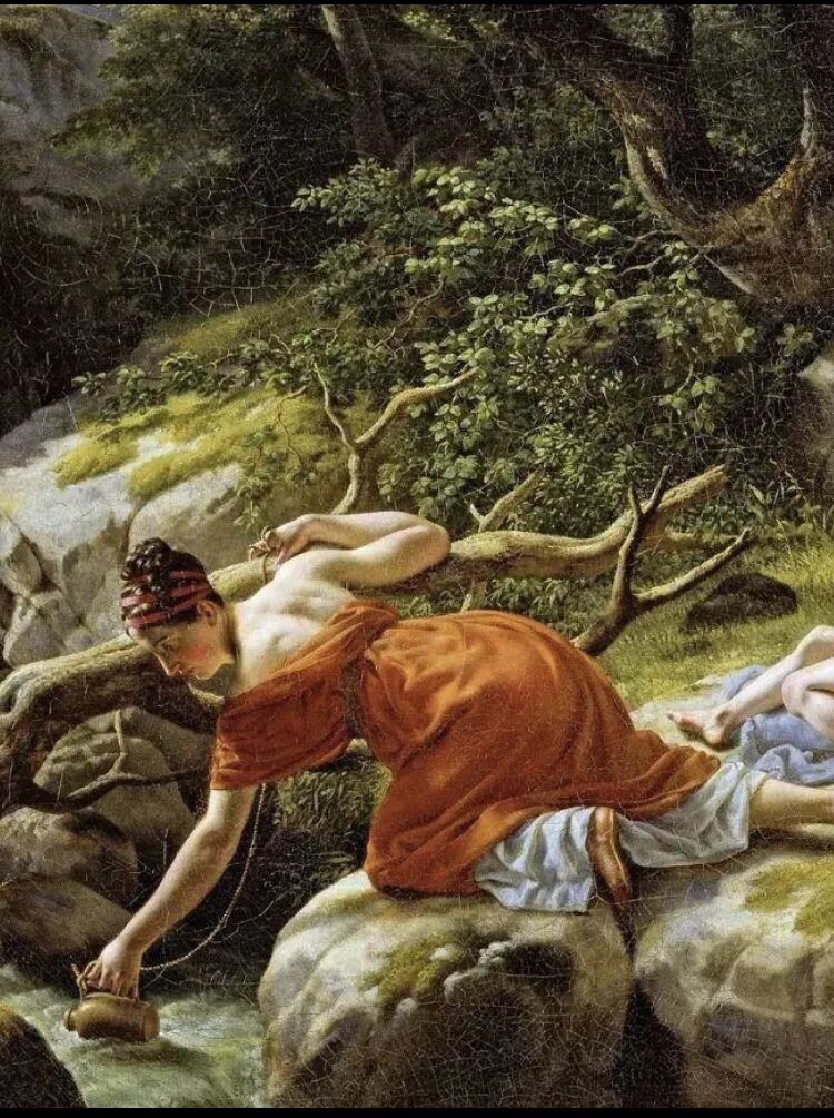 这舀水的动作幅度太大了吧,旁边那棵树感觉不可靠啊,一不小心也许会滑下去,旁边一位病人正等着喝水呢,不要一失足成千古怨啊!画家如此刻画,不是画蛇添足,而是是为了表达此时此刻,水是多么重要,水是生命之源,是救命的山泉水!所以再危险,也要匍匐下去捞水喝!