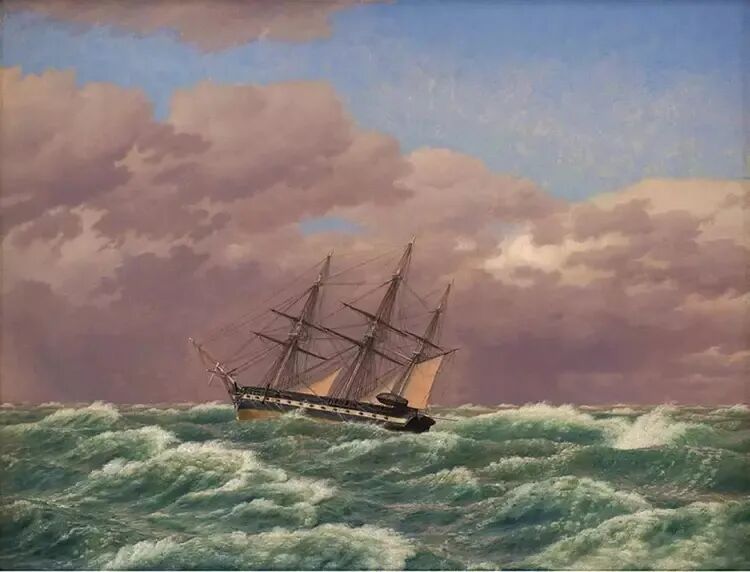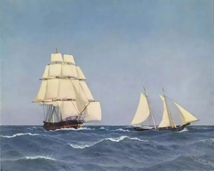 很多艺术家都喜欢四处游走,一边旅行,一边产生创作,这位画家也不例外!那时候远行的交通工具应该都是画中的这种帆船吧,扬帆起航,乘风破浪,海浪不断拍打着海岸,旅途中的这种意气风发的景观,估计也给画家创造了很多创作的灵感!
