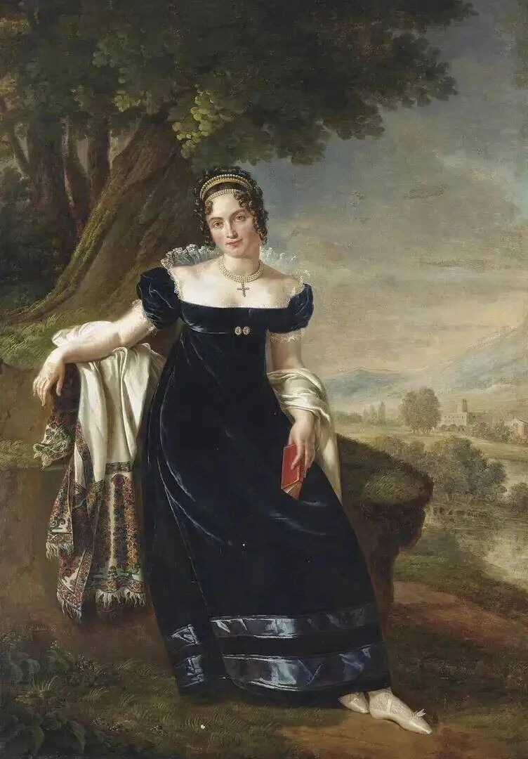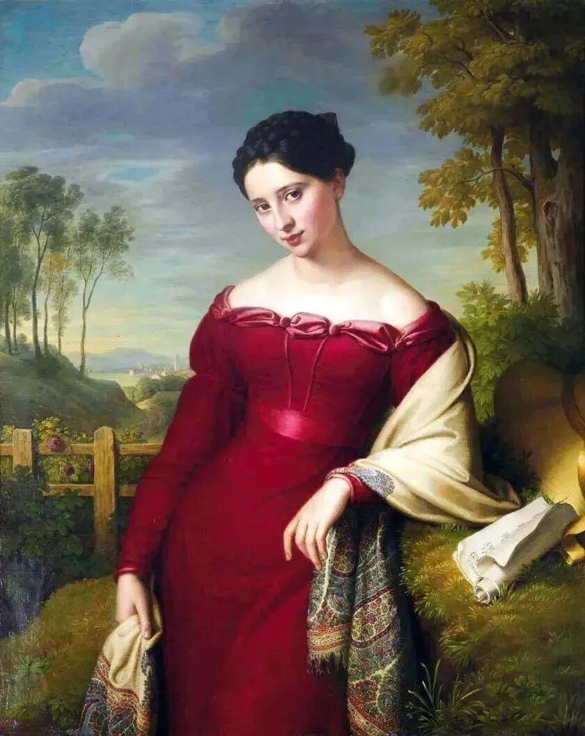 风和日丽,蓝天白云,在某处风景区,或者花园里,这位贵妇人穿得多么精致,红色抹胸裙,外加一件华丽的披肩!就那么站在青山绿水之间,旁边放在草坪上的估计是一本书!真的是“腹有诗书气自华”,一眼望去,就是一位书香门第的淑女气质,优雅而端庄!