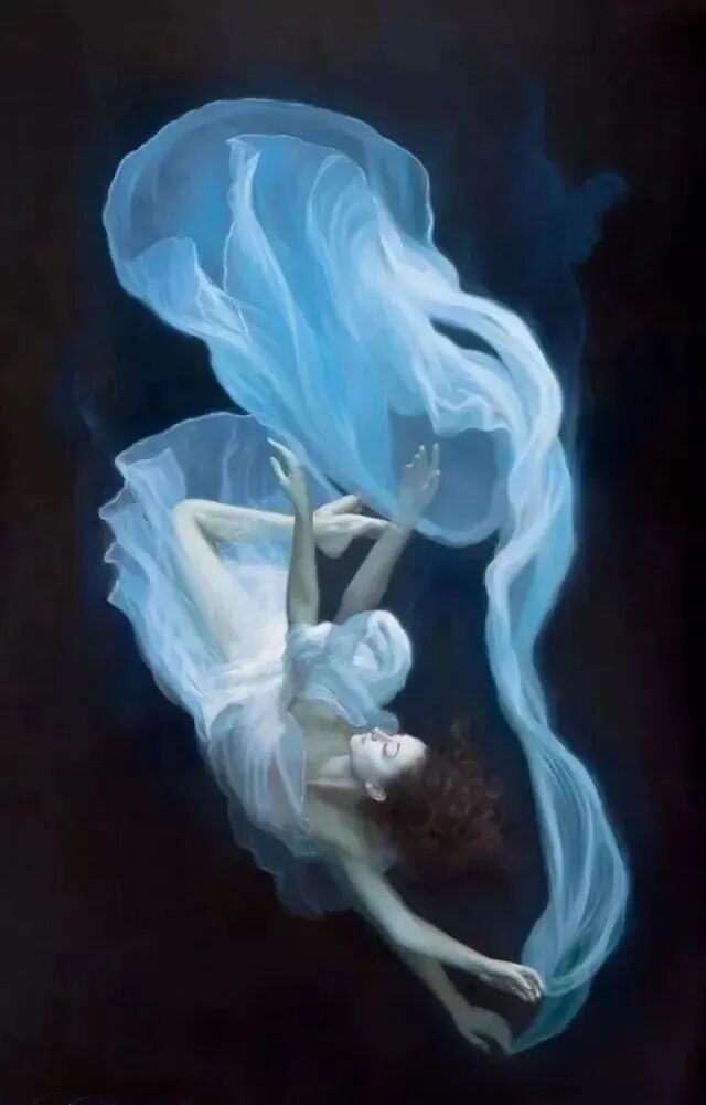 这幅油画最具视觉冲击力,在黑漆漆的夜空中,身披薄纱,腾空而起,如此缥缈虚无,肯定是非仙即妖或者是神女了!