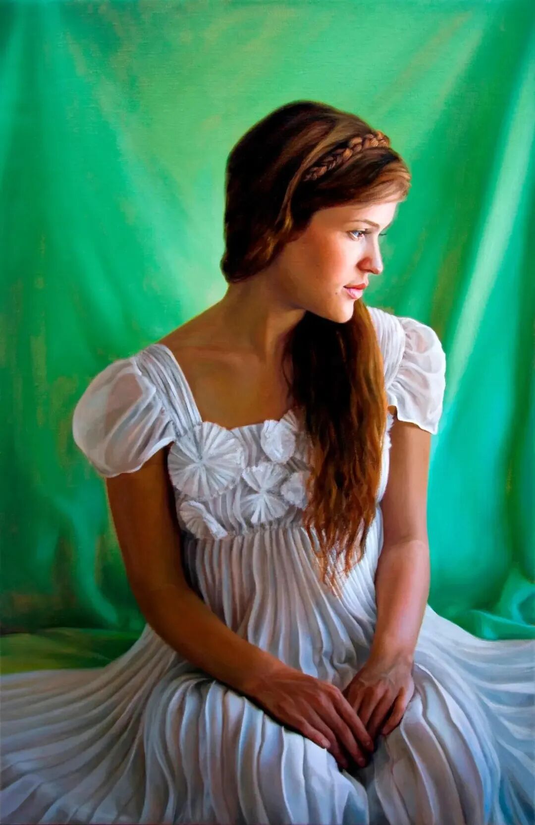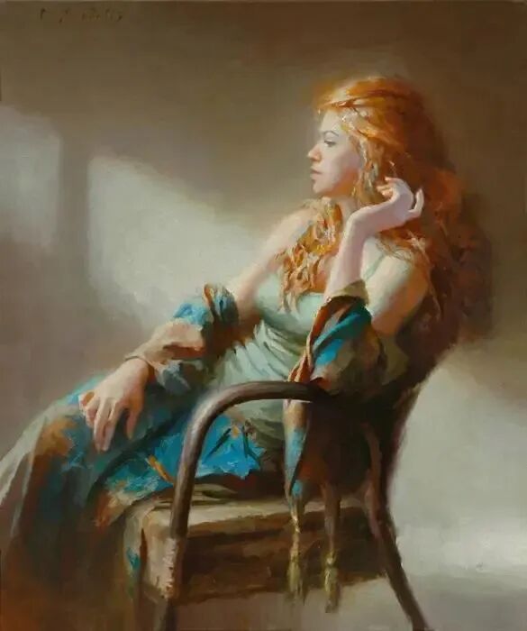 这幅画正好相反,她很安静地坐在椅子上,一缕阳光透过窗户,洒落在她身上,而她一只手轻轻上扬,若有所思,优雅而知性,一个有故事的女人,同样动人心弦!