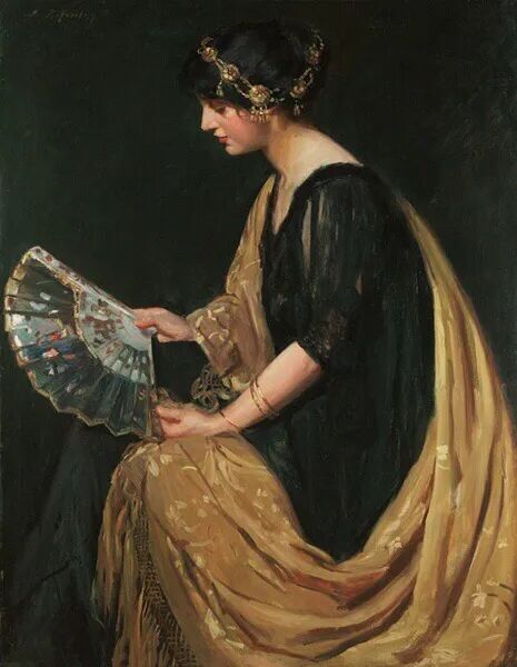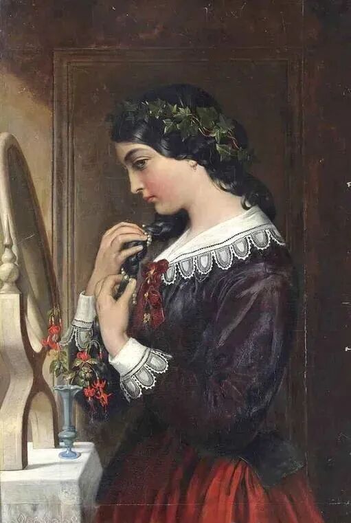《准备》,应该是在梳妆打扮,她一边梳理着辫子,一边若有所思,准备约会么,画家把女人那一点小心思描绘得十分生动!