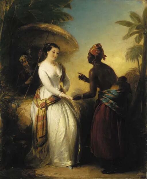 《算命先生》,一位背上系着小孩的黑人母亲在替一位贵妇人看手相,贫富差距在这幅画中一目了然!富人衣着华丽,背后还有一位年老的佣人替她遮风挡雨,女人皮肤白皙细嫩,而黑人母亲则是衣不蔽体,又老又丑,脏不垃圾、黑白分明的一幅画!