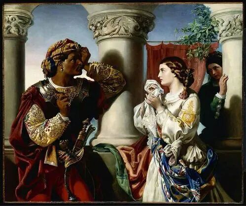 画面上展示的场景除了奥赛罗和苔丝狄蒙娜,还有躲在暗处的那个小人,他偷去了苔丝狄蒙娜手中的那块手绢!古代手帕之类的东西是女人的信物、定情物,一旦落入他人之手,那就是跟他有染!