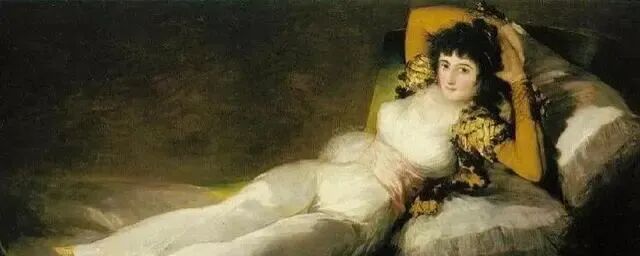 这是戈雅的代表作之一《着衣的玛哈》,另一幅不着衣的就不发了,入秋了,该保暖!画中的玛哈身份不确定,因而惹人瞩目,但肯定不是什么贵族小姐,她躺在那儿的姿势说明了一切!