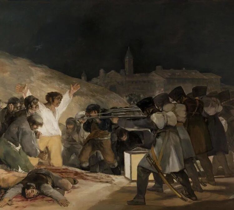 这幅画类似于纪实作品,描绘了拿破仑军队占领西班牙,西班牙起义者,在皮奥山附近被法军处决的场景。你看那一个个枪口对准了那些手无寸铁的西班牙人,已经有人倒在了血泊中,你此时投降也没用,那些士兵们已经杀红了眼睛,他们不会心慈手软手下留情。这就是战争,一旦发起,将会永无宁日,双手沾满血腥,所以我们一定要和平,远离战争!