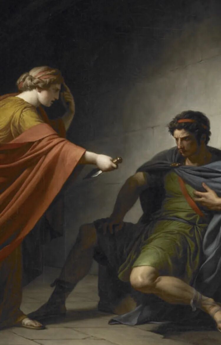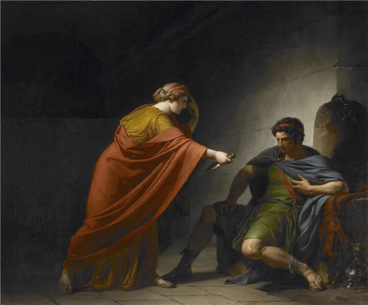 《阿里亚和佩图斯》,这幅画来自于一场惨烈的战争,将军身负重伤,已经面临死亡,女主不想独活,于是拔出匕首自杀!在网上没有找到资料,只是小编的猜测!