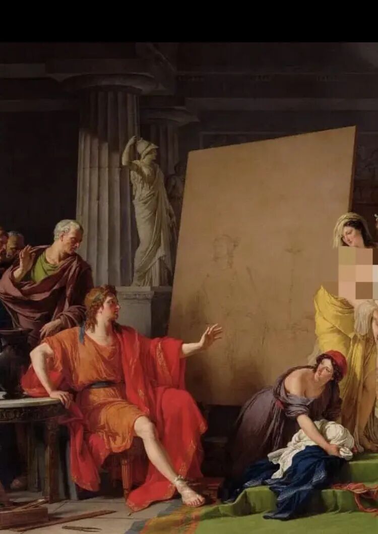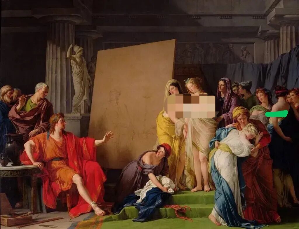 《选择克罗顿美女的宙克西斯》,是文森特创作的一幅人物角色众多的大型油画,题材来自于希腊神话!主要是描绘古希腊画家宙克西斯前往克罗顿城选择女模特的场景,右边的是一群美女,姿态各异,搔首弄姿,各有千秋,而左边坐在椅子上的红衣男子就是画家本人了,此刻他正指点她们如何出列!