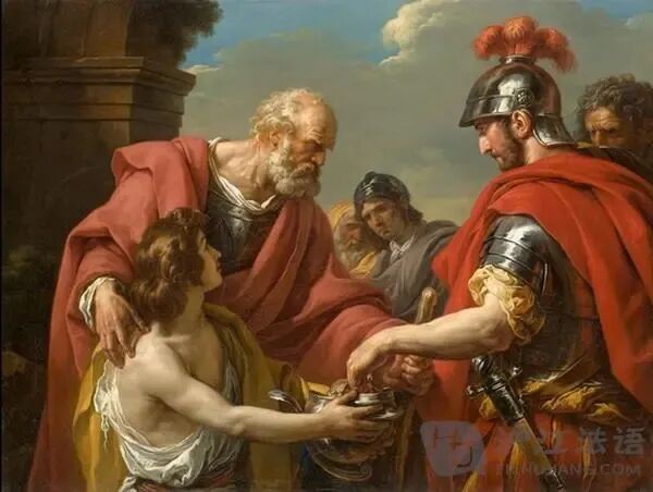 《乞讨的贝利撒留,为查士丁尼皇帝军队的一名军官所救济》,贝利撒留是东罗马帝国皇帝查士丁尼一世麾下大将,骁勇善战,但功高盖主,遭到皇帝猜忌!晚年将军眼瞎,沦为乞丐,画中展示的就是这个乞讨的场景,也说明了这名大将的为人处事,即使不再是大将,但依然有军官敬重他!