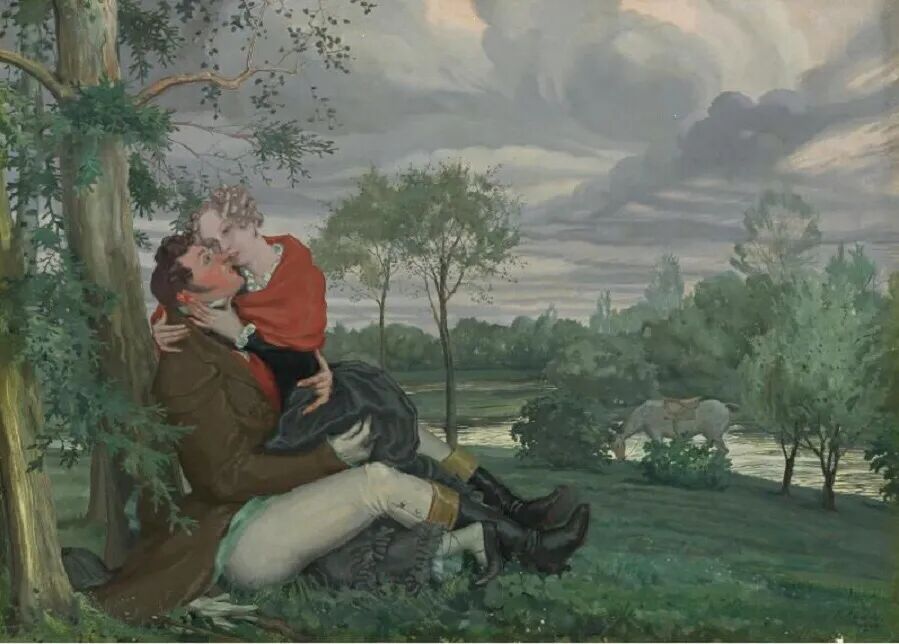 春天,草木葱茏,春意盎然,恋爱的季节!一旦爱上,就爱得死去活来肝肠寸断,你看画中的男人女人,爱得卑躬屈膝,都匍匐在地了,这也是画家表达情感的一种方式!