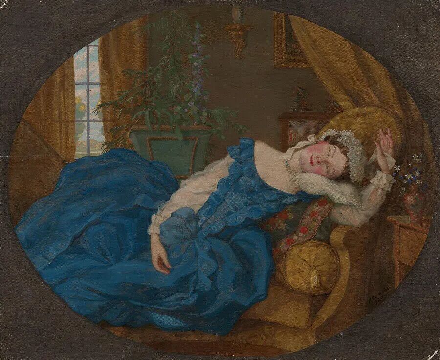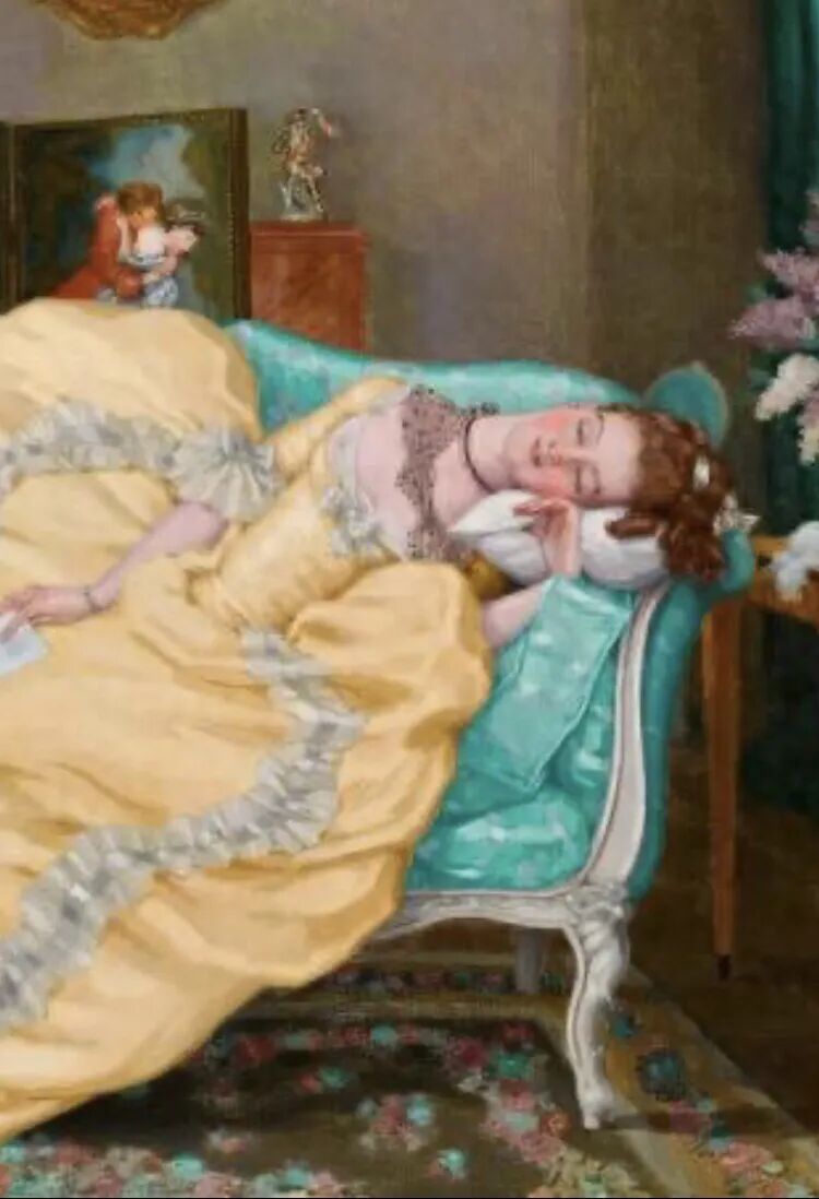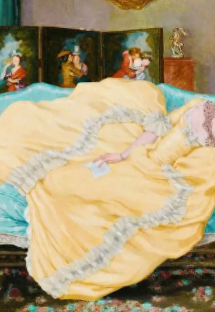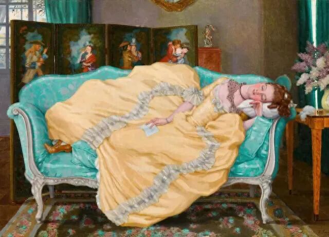 《睡在房间里的女人》,女人绯红的脸蛋,手中拿着的情书,连睡着啦都不舍得放下,睡意朦胧中她梦到了什么呢!床边墙上挂着的三张男女谈情说爱图说明了一切,画家的象征主义画法的确技高一筹,其微妙的构图背景,就不言而喻!